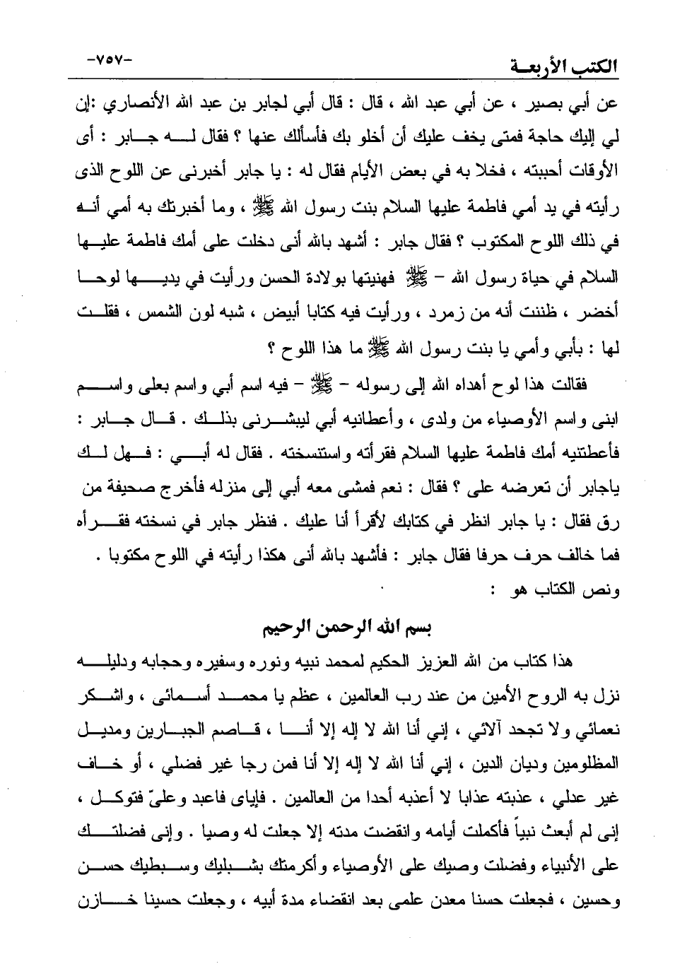 عن أبي بصير، عن أبي عبد الله، قال: قال أبي لجابر بن عبد الله الأنصاري: إن لي إليك حاجة فمتى يخف عليك أن أخلو بك فأسألك عنها؟ فقال له جابر: أى الأوقات أحببته، فخلا به في بعض الأيام فقال له: يا جابر أخبرنى عن اللوح الذى رأيته في يد أمي فاطمة عليها السلام بنت رسول الله صَلَّى اللهُ عَلَيْهِ وَسَلَّمَ، وما أخبرتك به أمي أنه في ذلك اللوح المكتوب؟ فقال جابر: أشهد بالله أنى دخلت على أمك فاطمة عليها السلام في حياة رسول الله - صَلَّى اللهُ عَلَيْهِ وَسَلَّمَ فهنيتها بولادة الحسن ورأيت في يديها لوحا أخضر، ظننت أنه من زمرد، ورأيت فيه كتابا أبيض، شبه لون الشمس، فقلت لها: بأبي وأمي يا بنت رسول الله صَلَّى اللهُ عَلَيْهِ وَسَلَّمَ ما هذا اللوح؟