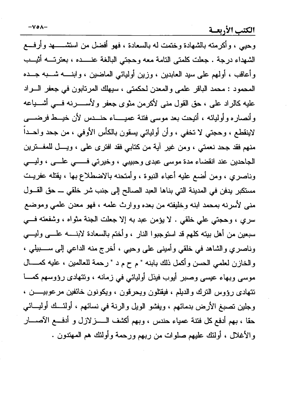 وحيي، وأكرمته بالشهادة وختمت له بالسعادة، فهو أفضل من استشهد وأرفع الشهداء درجة. جعلت كلمتى التامة معه وحجتي البالغة عنده، بعترته أثيب وأعاقب، أولهم على سيد العابدين، وزين أوليائي الماضين، وابنه شبه جده المحمود: محمد الباقر علمى والمعدن لحكمتى، سيهلك المرتابون في جعفر الراد عليه كالراد على، حق القول منى لأكرمن مثوى جعفر ولأسرنه في أشياعه وأنصاره وأوليائه، أتيحت بعد موسى فتنة عمياء حندس لأن خيط فرضى لاينقطع، وحجتي لا تخفي، وأن أوليائي يسقون بالكأس الأوفي، من جحد واحداً منهم فقد جحد نعمتي، ومن غير آية من كتابي فقد افترى على، ويل للمفترين الجاحدين عند انقضاء مدة موسى عبدى وحبيبي، وخيرتي في على، وليي وناصري، ومن أضع عليه أعباء النبوة، وأمتحنه بالاضطلاع بها، يقتله عفريت مستكبر يدفن في المدينة التي بناها العبد الصالح إلى جنب شر خلقي ـ حق القول منى لأسرنه بمحمد ابنه وخليفته من بعده ووارث علمه، فهو معدن علمي وموضع سري، وحجتي علي خلقي.