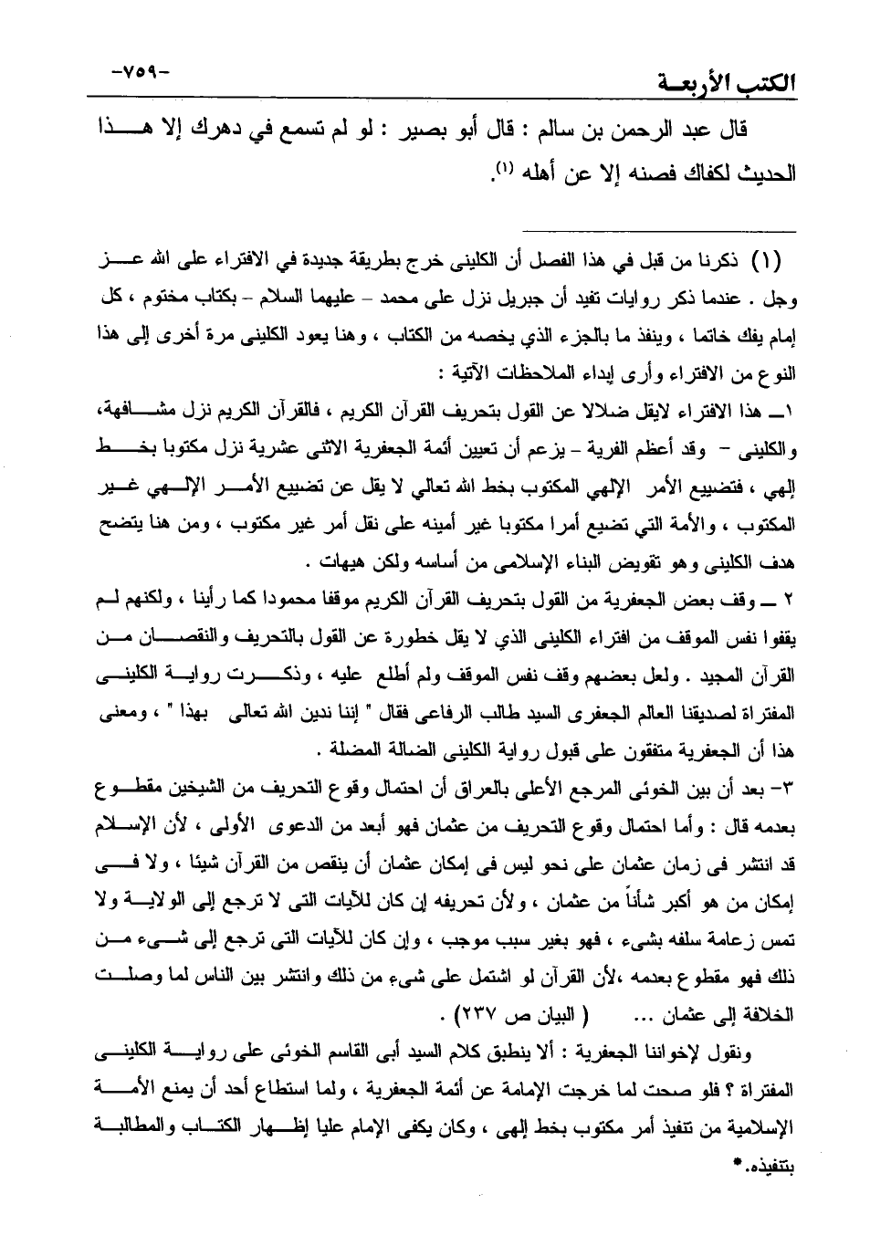 3- بعد أن بين الخوئى المرجع الأعلى بالعراق أن احتمال وقوع التحريف من الشيخين مقطوع بعدمه قال: وأما احتمال وقوع التحريف من عثمان فهو أبعد من الدعوى الأولى، لأن الإسلام قد انتشر فى زمان عثمان على نحو ليس فى إمكان عثمان أن ينقص من القرآن شيئا، ولا فى إمكان من هو أكبر شأناً من عثمان، ولأن تحريفه إن كان للآيات التى لا ترجع إلى الولاية ولا تمس زعامة سلفه بشىء، فهو بغير سبب موجب، وإن كان للآيات التى ترجع إلى شىء من ذلك فهو مقطوع بعدمه، لأن القرآن لو اشتمل على شىء من ذلك وانتشر بين الناس لما وصلت الخلافة إلى عثمان ... ... (البيان ص 237) .