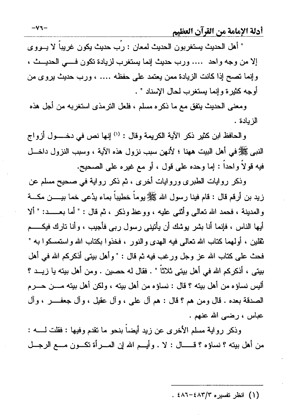 وذكر روايات الطبري وروايات أخرى، ثم ذكر رواية في صحيح مسلم عن زيد بن أرقم قال: قام فينا رسول الله صَلَّى اللهُ عَلَيْهِ وَسَلَّمَ يوماً خطيباً بماء يدُعى خما بين مكة والمدينة، فحمد الله تعالى وأثنى عليه، ووعظ وذكر، ثم قال: " أما بعد: " ألا أيها الناس، فإنما أنا بشر يوشك أن يأتينى رسول ربى فأجيب، وأنا تارك فيكم ثقلين، أولهما كتاب الله تعالى فيه الهدى والنور، فخذوا بكتاب الله واستمسكوا به " فحث على كتاب الله عز وجل ورغب فيه ثم قال: " وأهل بيتي أذكركم الله في أهل بيتي، أذكركم الله في أهل بيتي ثلاثاً ". فقال له حصين. ومن أهل بيته يا زيد؟ أليس نساؤه من أهل بيته؟ قال: نساؤه من أهل بيته، ولكن أهل بيته من حرم الصدقة بعده. قال ومن هم؟ قال: هم آل على، وآل عقيل، وآل جعفر، وآل عباس، رضي الله عنهم.