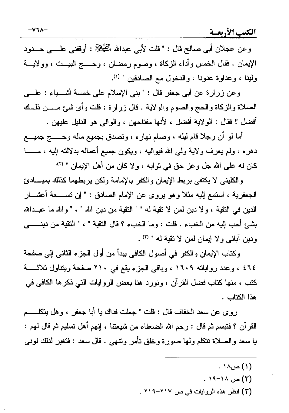 وكتاب الإيمان والكفر في أصول الكافى يبدأ من أول الجزء الثانى إلى صفحة 464، وعدد رواياته 1609، وباقى الجزء يقع في 210 صفحة ويتناول ثلاثة كتب، منها كتاب فضل القرآن، ونورد هنا بعض الروايات التي ذكرها الكافى في هذا الكتاب.