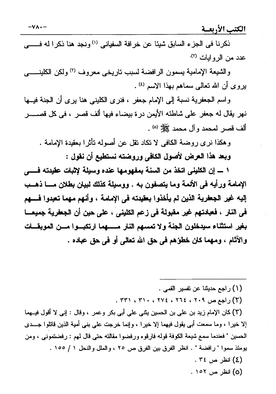 (¬3) كان الإمام زيد بن على بن الحسين يثنى على أبى بكر وعمر، وقال: إنى لا أقول فيهما إلا خيراً، وما سمعت أبى يقول فيهما إلا خيراً، وإنما خرجت على بنى أمية الذين قاتلوا جدى الحسين " فعندما سمع شيعة الكوفة قوله فارقوه ورفضوا مقالته حتى قال لهم: رفضتمونى، ومن يومئذ سموا " رافضة ". انظر الفرق بين الفرق ص 25، والملل والنحل 1 / 155.
