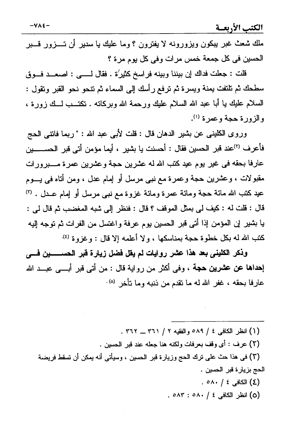 وذكر الكلينى بعد هذا عشر روايات لم يقل فضل زيارة قبر الحسين فى إحداها عن عشرين حجة، وفى أكثر من رواية قال: من أتى قبر أبى عبد الله عارفاً بحقه، غفر الله له ما تقدم من ذنبه وما تأخر (¬5) .