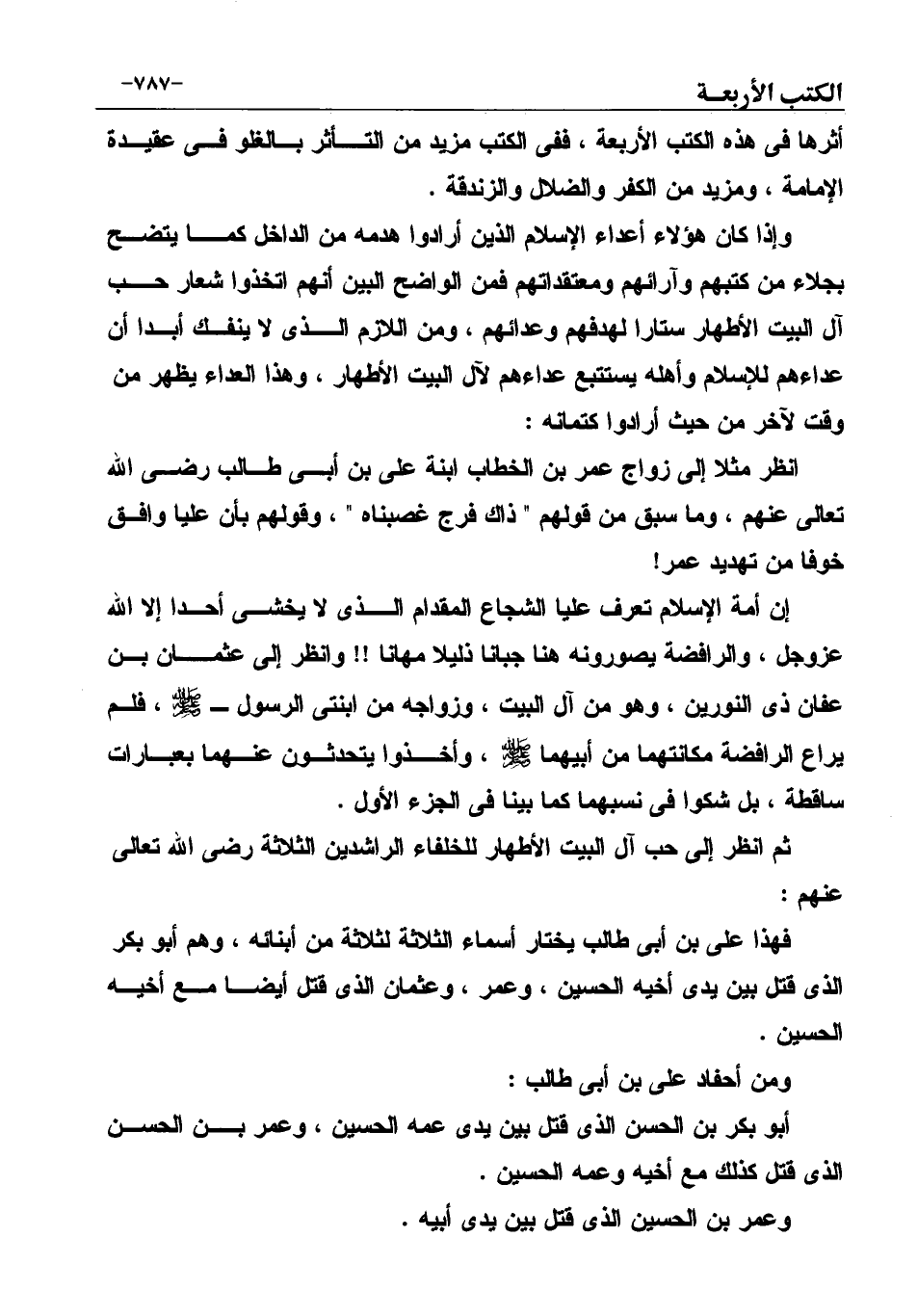 إن أمة الإسلام تعرف علياً الشجاع المقدام الذى لا يخشى أحداً إلا الله عزوجل، والرافضة يصورونه هنا جباناً ذليلاً مهاناً!! وانظر إلى عثمان بن عفان ذى النورين، وهو من آل البيت، وزواجه من ابنتى الرسول ـ صَلَّى اللهُ عَلَيْهِ وَسَلَّمَ، فلم يراع الرافضة مكانتهما من أبيهما صَلَّى اللهُ عَلَيْهِ وَسَلَّمَ، وأخذوا يتحدثون عنهما بعبارات ساقطة، بل شكوا فى نسبهما كما بينا فى الجزء الأول.