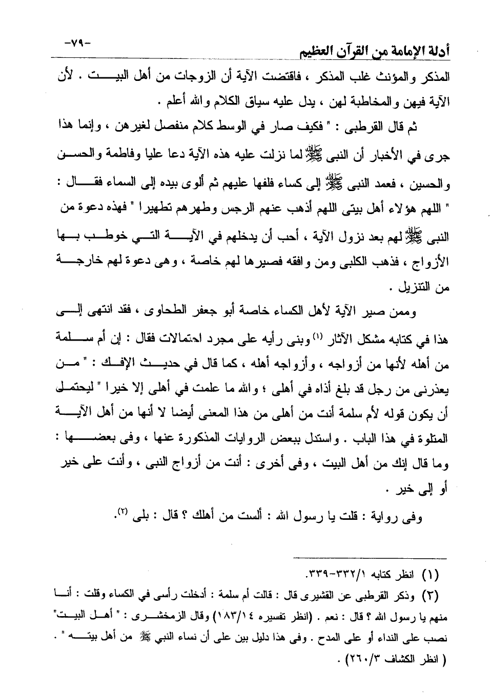 (¬2) وذكر القرطبى عن القشيرى قال: قالت أم سلمة: أدخلت رأسى في الكساء وقلت: أنا منهم يا رسول الله؟ قال: نعم. (انظر تفسيره 14/183) وقال الزمخشري: " أهل البيت" نصب على النداء أو على المدح. وفى هذا دليل بين على أن نساء النبي - صَلَّى اللهُ عَلَيْهِ وَسَلَّمَ - من أهل بيته ". ... (انظر الكشاف 3/260) .