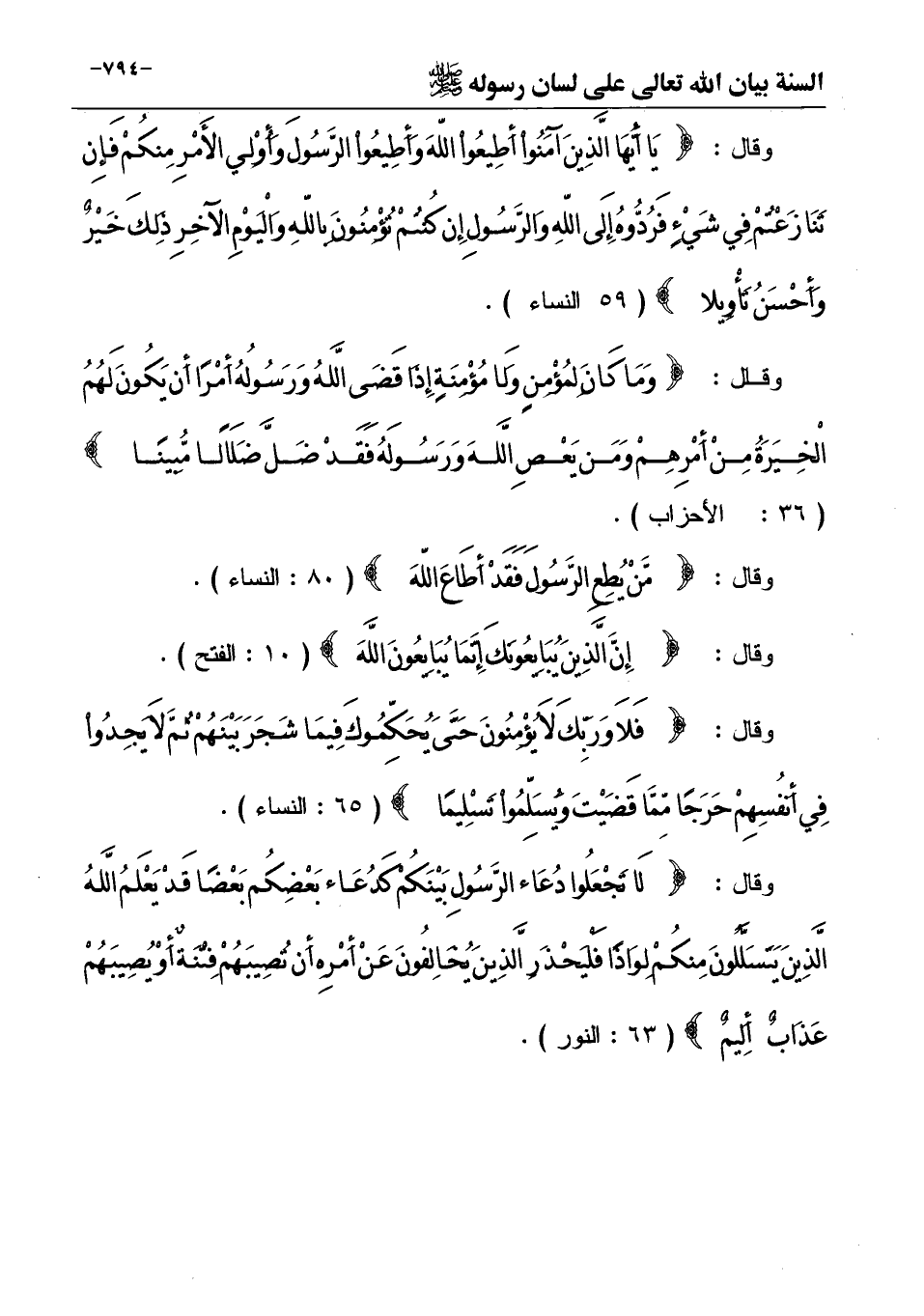 وقال: {يَا أَيُّهَا الَّذِينَ آمَنُواْ أَطِيعُواْ اللهَ وَأَطِيعُواْ الرَّسُولَ وَأُوْلِي الأَمْرِ مِنكُمْ فَإِن تَنَازَعْتُمْ فِي شَيْءٍ فَرُدُّوهُ إِلَى اللهِ وَالرَّسُولِ إِن كُنتُمْ تُؤْمِنُونَ بِاللهِ وَالْيَوْمِ الآخِرِ ذَلِكَ خَيْرٌ وَأَحْسَنُ تَأْوِيلا} (59 النساء) .