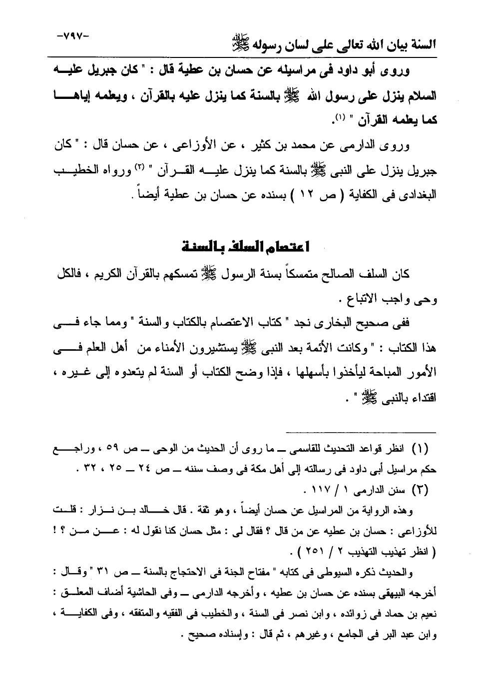 وروى الدارمى عن محمد بن كثير، عن الأوزاعى، عن حسان قال: " كان جبريل ينزل على النبى صَلَّى اللهُ عَلَيْهِ وَسَلَّمَ بالسنة كما ينزل عليه القرآن " (¬2) ورواه الخطيب البغدادى فى الكفاية (ص 12) بسنده عن حسان بن عطية أيضاً.