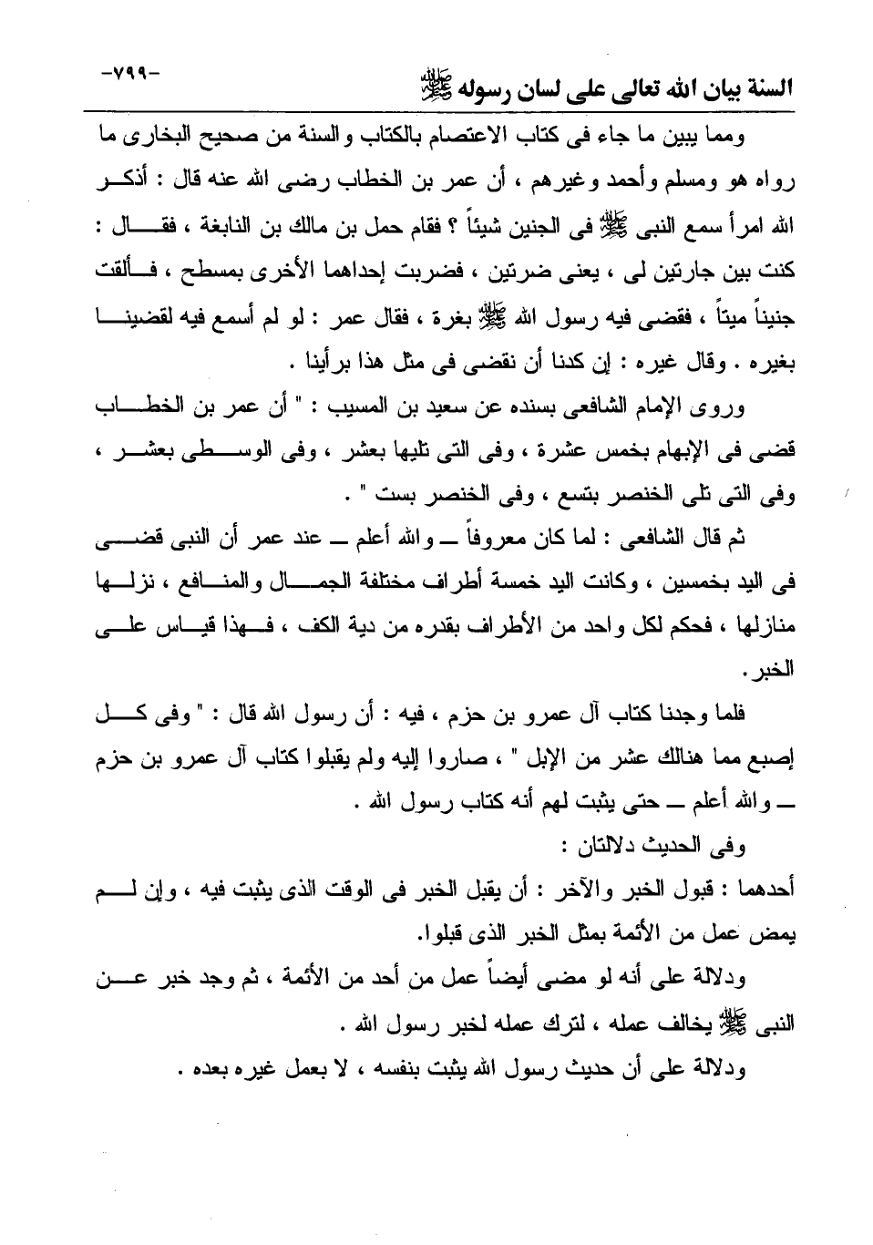 ومما يبين ما جاء فى كتاب الاعتصام بالكتاب والسنة من صحيح البخارى ما رواه هو ومسلم وأحمد وغيرهم، أن عمر بن الخطاب رضى الله عنه قال: أذكر الله امرأ سمع النبى صَلَّى اللهُ عَلَيْهِ وَسَلَّمَ فى الجنين شيئاً؟ فقام حمل بن مالك بن النابغة، فقال: كنت بين جارتين لى، يعنى ضرتين، فضربت إحداهما الأخرى بمسطح، فألقت جنيناً ميتاً، فقضى فيه رسول الله صَلَّى اللهُ عَلَيْهِ وَسَلَّمَ بغرة، فقال عمر: لو لم أسمع فيه لقضينا بغيره. وقال غيره: إن كدنا أن نقضى فى مثل هذا برأينا.