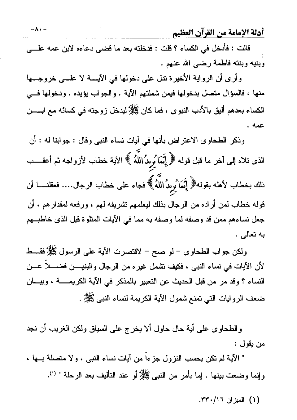 ولكن جواب الطحاوي - لو صح - لاقتصرت الآية على الرسول صَلَّى اللهُ عَلَيْهِ وَسَلَّمَ فقط لأن الآيات في نساء النبي، فكيف تشمل غيره من الرجال والبنين فضلاً عن النساء؟ وقد مر من قبل الحديث عن التعبير بالمذكر في الآية الكريمة، وبيان ضعف الروايات التي تمنع شمول الآية الكريمة لنساء النبي صَلَّى اللهُ عَلَيْهِ وَسَلَّمَ.