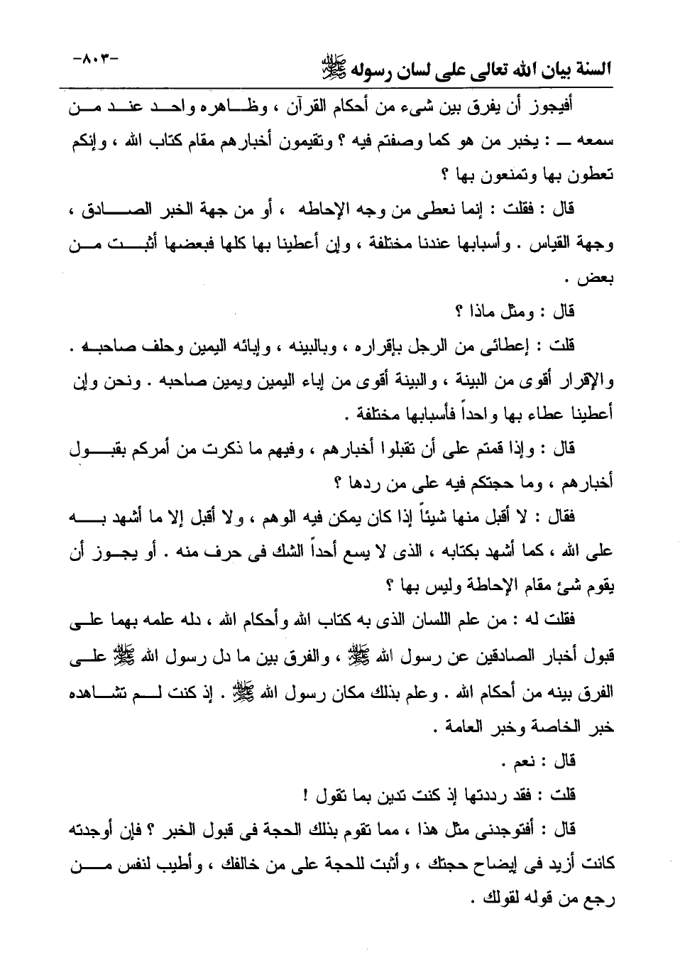 فقلت له: من علم اللسان الذى به كتاب الله وأحكام الله، دله علمه بهما على قبول أخبار الصادقين عن رسول الله صَلَّى اللهُ عَلَيْهِ وَسَلَّمَ، والفرق بين ما دل رسول الله صَلَّى اللهُ عَلَيْهِ وَسَلَّمَ على الفرق بينه من أحكام الله. وعلم بذلك مكان رسول الله صَلَّى اللهُ عَلَيْهِ وَسَلَّمَ. إذ كنت لم تشاهده خبر الخاصة وخبر العامة.