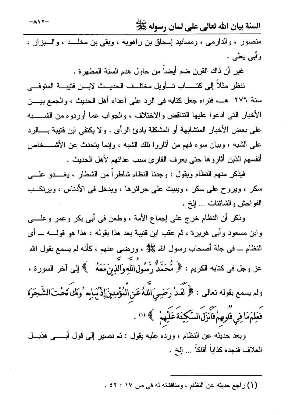وذكر أن النظام خرج على إجماع الأمة، وطعن فى أبى بكر وعمر وعلى وابن مسعود وأبى هريرة، ثم عقب ابن قتيبة بعد هذا بقوله: هذا هو قوله ـ أى النظام ـ فى جلة أصحاب رسول الله صَلَّى اللهُ عَلَيْهِ وَسَلَّمَ، ورضى عنهم، كأنه لم يسمع بقول الله عز وجل فى كتابه الكريم: {مُّحَمَّدٌ رَّسُولُ اللَّهِ وَالَّذِينَ مَعَهُ} إلى آخر السورة، ولم يسمع بقوله تعالى: {لَقَدْ رَضِيَ اللَّهُ عَنِ الْمُؤْمِنِينَ إِذْ يُبَايِعُونَكَ تَحْتَ الشَّجَرَةِ فَعَلِمَ مَا فِي قُلُوبِهِمْ فَأَنزَلَ السَّكِينَةَ عَلَيْهِمْ} (¬1) .