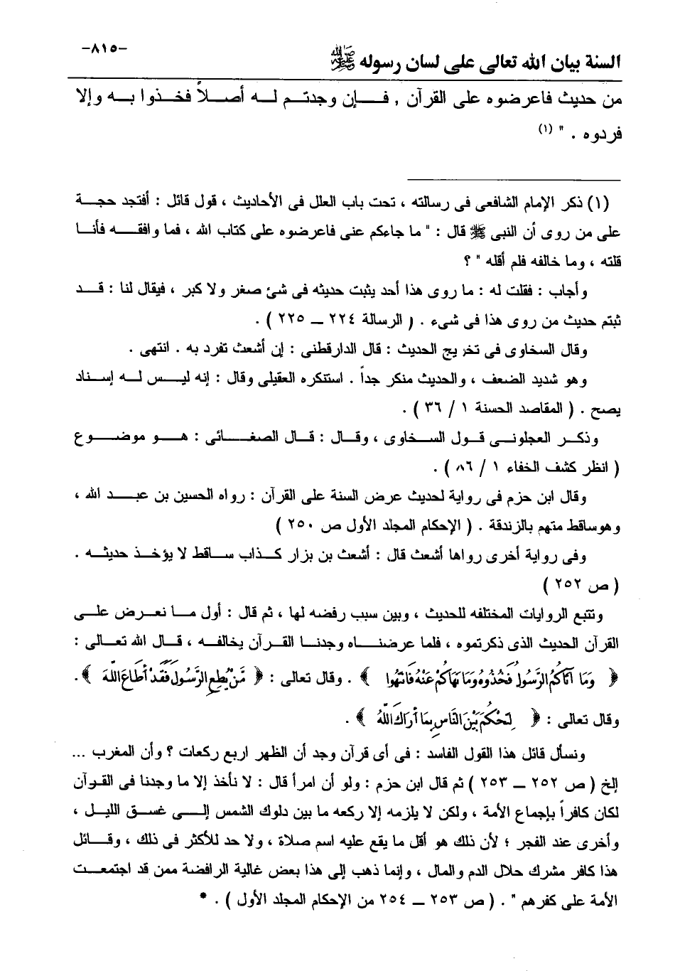 وهو شديد الضعف، والحديث منكر جداً. استنكره العقيلى وقال: إنه ليس له إسناد يصح. (المقاصد الحسنة 1 / 36) . وذكر العجلونى قول السخاوى، وقال: قال الصغائى: هو موضوع (انظر كشف الخفاء 1 / 86) . وقال ابن حزم فى رواية لحديث عرض السنة على القرآن: رواه الحسين بن عبد الله، وهوساقط متهم بالزندقة. (الإحكام المجلد الأول ص 250) وفى رواية أخرى رواها أشعث قال: أشعث بن بزار كذاب ساقط لا يؤخذ حديثه. (ص 252) وتتبع الروايات المختلفه للحديث، وبين سبب رفضه لها، ثم قال: أول ما نعرض على القرآن الحديث الذى ذكرتموه، فلما عرضناه وجدنا القرآن يخالفه، قال الله تعالى: {وَمَا آتَاكُمُ الرَّسُولُ فَخُذُوهُ وَمَا نَهَاكُمْ عَنْهُ فَانتَهُوا} . وقال تعالى: {مَّنْ يُطِعِ الرَّسُولَ فَقَدْ أَطَاعَ اللهَ} . وقال تعالى: {لِتَحْكُمَ بَيْنَ النَّاسِ بِمَا أَرَاكَ اللهُ} . ونسأل قائل هذا القول الفاسد: فى أى قرآن وجد أن الظهر اربع ركعات؟ وأن المغرب ... إلخ (ص 252 ـ 253) ثم قال ابن حزم: ولو أن امرأ قال: لا نأخذ إلا ما وجدنا فى القرآن لكان كافراً بإجماع الأمة، ولكن لا يلزمه إلا ركعه ما بين دلوك الشمس إلى غسق الليل، وأخرى عند الفجر؛ لأن ذلك هو أقل ما يقع عليه اسم صلاة، ولا حد للأكثر فى ذلك، وقائل هذا كافر مشرك حلال الدم والمال، وإنما ذهب إلى هذا بعض غالية الرافضة ممن قد اجتمعت الأمة على كفرهم ". (ص 253 ـ 254 من الإحكام المجلد الأول) . *وقال الشيخ شاكر فى تخريج الحديث: هذا المعنى لم يرد فيه حديث صحيح ولا حسن، بل وردت فيه ألفاظ كثيرة، كلها موضوع أو بالغ الغاية فى الضعف، حتى لا يصلح شىء منها للاحتجاج أو الاستشهاد. ثم أفاض فى بيانه ـ انظر حاشية ص 224، 225 من الرسالة.