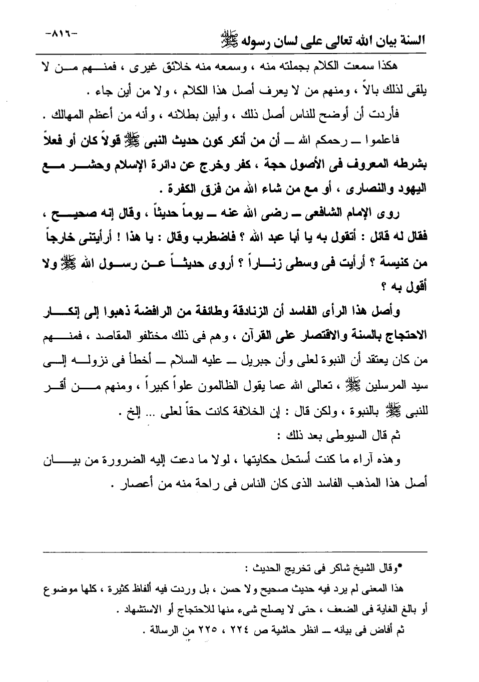 فاعلموا ـ رحمكم الله ـ أن من أنكر كون حديث النبى صَلَّى اللهُ عَلَيْهِ وَسَلَّمَ قولاً كان أو فعلاً بشرطه المعروف فى الأصول حجة، كفر وخرج عن دائرة الإسلام وحشر مع اليهود والنصارى، أو مع من شاء الله من فرق الكفرة.