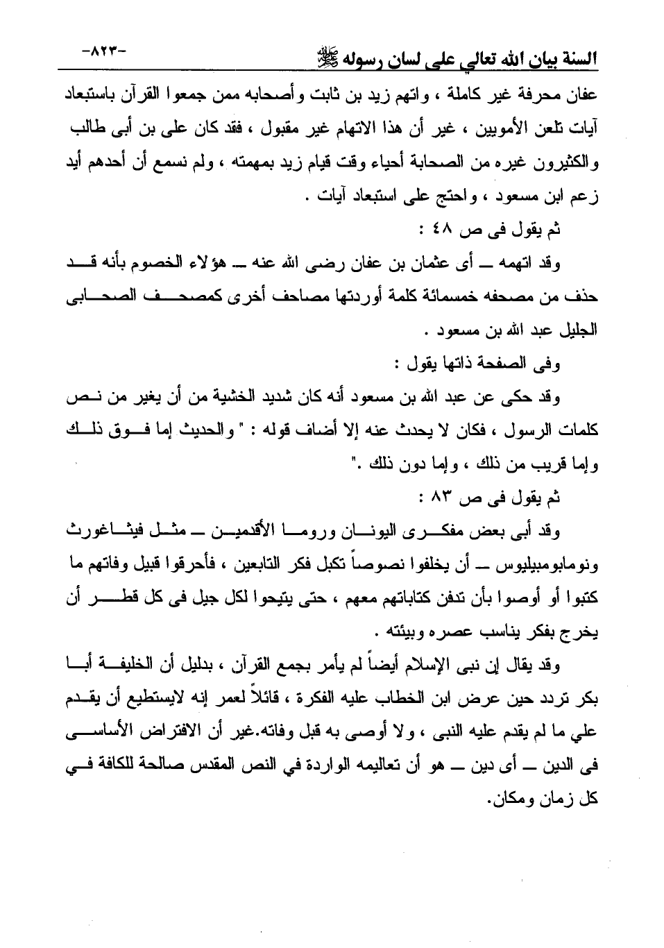 ثم يقول فى ص 48: وقد اتهمه ـ أى عثمان بن عفان رضى الله عنه ـ هؤلاء الخصوم بأنه قد حذف من مصحفه خمسمائة كلمة أوردتها مصاحف أخرى كمصحف الصحابى الجليل عبد الله بن مسعود.