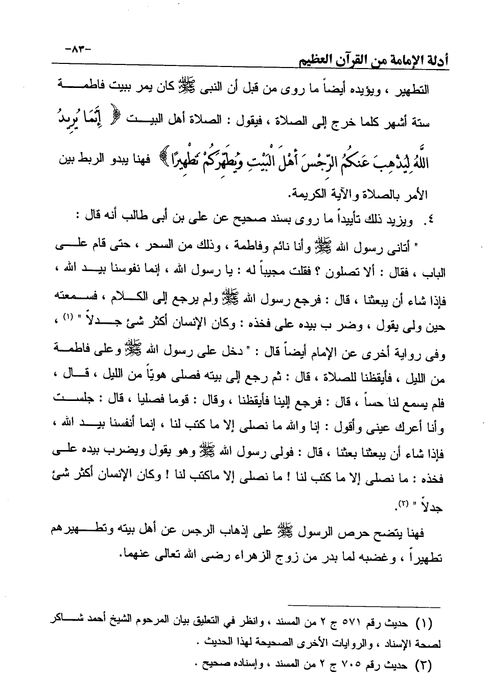 " أتانى رسول الله صَلَّى اللهُ عَلَيْهِ وَسَلَّمَ وأنا نائم وفاطمة، وذلك من السحر، حتى قام على الباب، فقال: ألا تصلون؟ فقلت مجيباً له: يا رسول الله، إنما نفوسنا بيد الله، فإذا شاء أن يبعثنا، قال: فرجع رسول الله صَلَّى اللهُ عَلَيْهِ وَسَلَّمَ ولم يرجع إلى الكلام، فسمعته حين ولى يقول، وضر ب بيده على فخذه: وكان الإنسان أكثر شئ جدلاً " (¬1) ، وفى رواية أخرى عن الإمام أيضاً قال: " دخل على رسول الله صَلَّى اللهُ عَلَيْهِ وَسَلَّمَ وعلى فاطمة من الليل، فأيقظنا للصلاة، قال: ثم رجع إلى بيته فصلى هويّاً من الليل، قال، فلم يسمع لنا حساً، قال: فرجع إلينا فأيقظنا، وقال: قوما فصليا، قال: جلست وأنا أعرك عينى وأقول: إنا والله ما نصلى إلا ما كتب لنا، إنما أنفسنا بيد الله، فإذا شاء أن يبعثنا بعثنا، قال: فولى رسول الله صَلَّى اللهُ عَلَيْهِ وَسَلَّمَ وهو يقول ويضرب بيده على فخذه: ما نصلى إلا ما كتب لنا! ما نصلى إلا ماكتب لنا! وكان الإنسان أكثر شئ جدلاً " (¬2) .