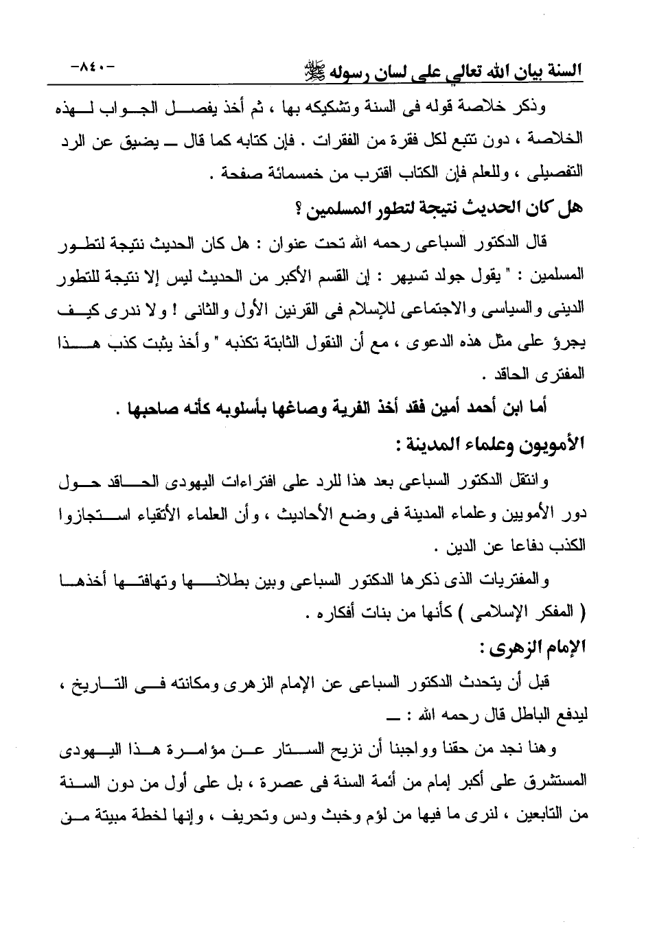 قال الدكتور السباعى رحمه الله تحت عنوان: هل كان الحديث نتيجة لتطور المسلمين: " يقول جولد تسيهر: إن القسم الأكبر من الحديث ليس إلا نتيجة للتطور الدينى والسياسى والاجتماعى للإسلام فى القرنين الأول والثانى! ولا ندرى كيف يجرؤ على مثل هذه الدعوى، مع أن النقول الثابتة تكذبه " وأخذ يثبت كذب هذا المفترى الحاقد. أما ابن أحمد أمين فقد أخذ الفرية وصاغها بأسلوبه كأنه صاحبها.