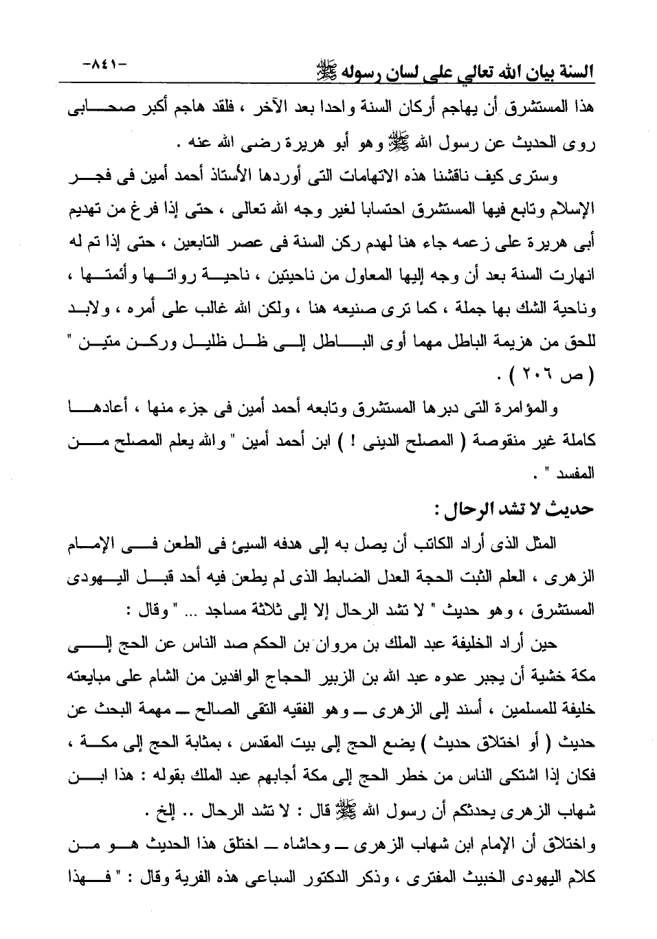 حديث لا تشد الرحال: المثل الذى أراد الكاتب أن يصل به إلى هدفه السيئ فى الطعن فى الإمام الزهرى، العلم الثبت الحجة العدل الضابط الذى لم يطعن فيه أحد قبل اليهودى المستشرق، وهو حديث " لا تشد الرحال إلا إلى ثلاثة مساجد ... " وقال: حين أراد الخليفة عبد الملك بن مروان بن الحكم صد الناس عن الحج إلى مكة خشية أن يجبر عدوه عبد الله بن الزبير الحجاج الوافدين من الشام على مبايعته خليفة للمسلمين، أسند إلى الزهرى ـ وهو الفقيه التقى الصالح ـ مهمة البحث عن حديث (أو اختلاق حديث) يضع الحج إلى بيت المقدس، بمثابة الحج إلى مكة، فكان إذا اشتكى الناس من خطر الحج إلى مكة أجابهم عبد الملك بقوله: هذا ابن شهاب الزهرى يحدثكم أن رسول الله صَلَّى اللهُ عَلَيْهِ وَسَلَّمَ قال: لا تشد الرحال.. إلخ.