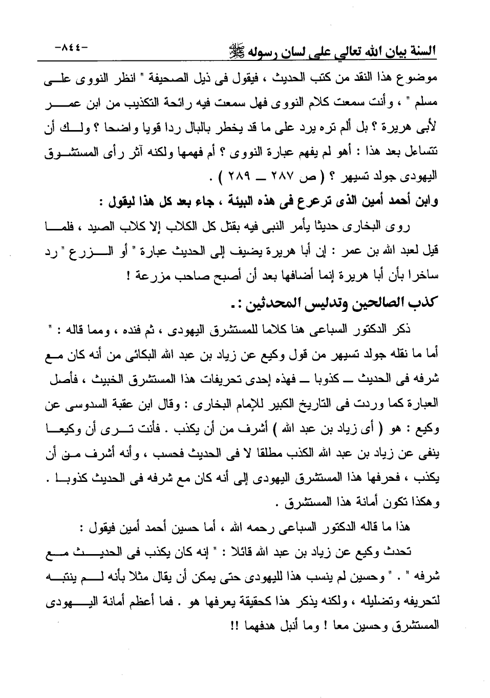 موضوع هذا النقد من كتب الحديث، فيقول فى ذيل الصحيفة " انظر النووى على مسلم "، وأنت سمعت كلام النووى فهل سمعت فيه رائحة التكذيب من ابن عمر لأبى هريرة؟ بل ألم تره يرد على ما قد يخطر بالبال ردا قوياً واضحاً؟ ولك أن تتساءل بعد هذا: أهو لم يفهم عبارة النووى؟ أم فهمها ولكنه آثر رأى المستشرق اليهودى جولد تسيهر؟ (ص 287 ـ 289) . وابن أحمد أمين الذي ترعرع في هذه البيئة، جاء بعد كل هذا ليقول: