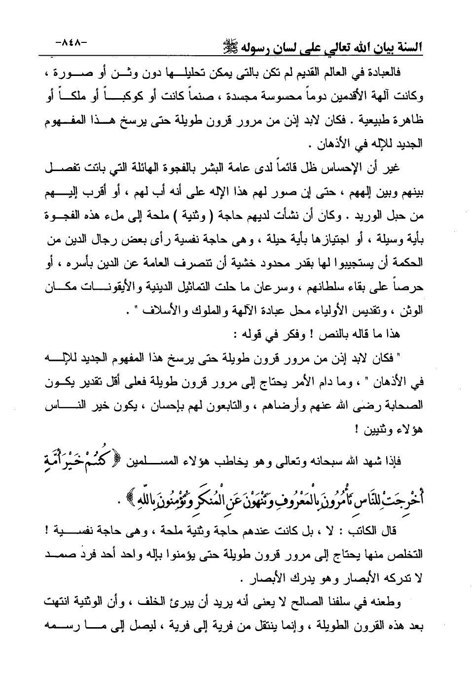 هذا ما قاله بالنص! وفكر في قوله: " فكان لابد إذن من مرور قرون طويلة حتى يرسخ هذا المفهوم الجديد للإله في الأذهان "، وما دام الأمر يحتاج إلى مرور قرون طويلة فعلى أقل تقدير يكون الصحابة رضى الله عنهم وأرضاهم، والتابعون لهم بإحسان، يكون خير الناس هؤلاء وثنيين!