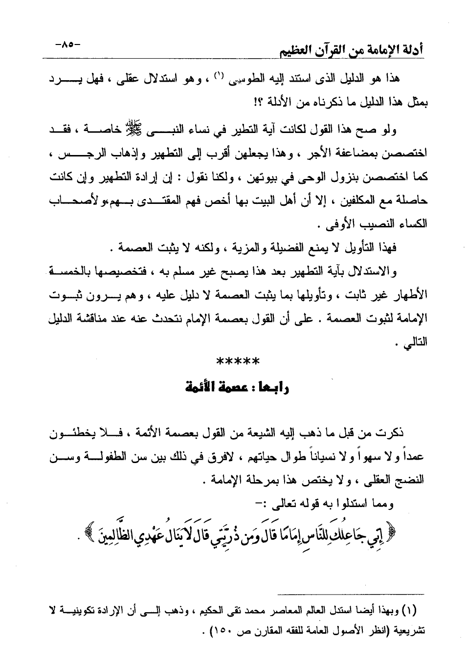 والاستدلال بآية التطهير بعد هذا يصبح غير مسلم به، فتخصيصها بالخمسة الأطهار غير ثابت، وتأويلها بما يثبت العصمة لا دليل عليه، وهم يرون ثبوت الإمامة لثبوت العصمة. على أن القول بعصمة الإمام نتحدث عنه عند مناقشة الدليل التالي.