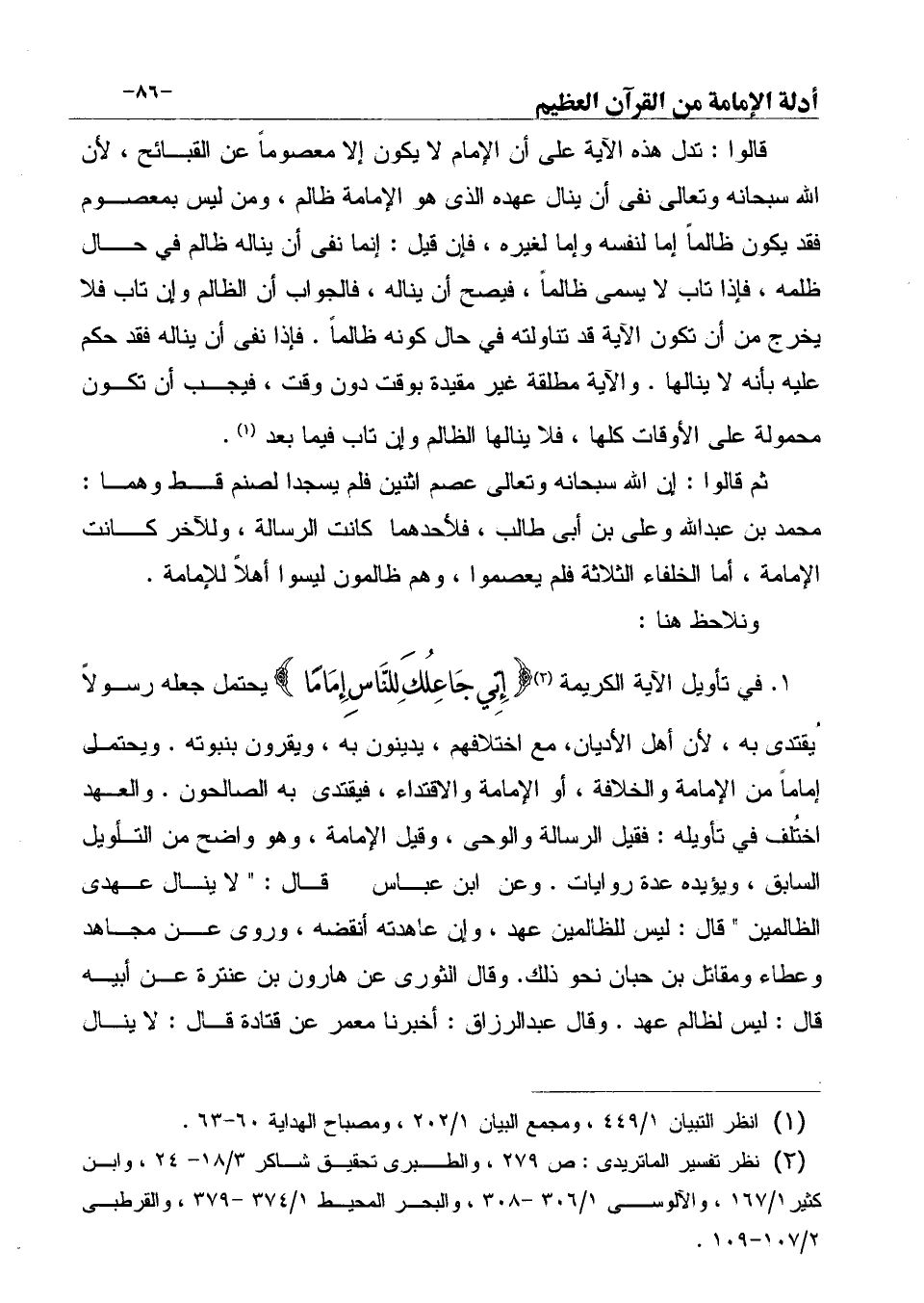 1. في تأويل الآية الكريمة (¬2) " إِنِّي جَاعِلُكَ لِلنَّاسِ إِمَامًا " يحتمل جعله رسولاً ُيقتدي به، لأن أهل الأديان، مع اختلافهم، يدينون به، ويقرون بنبوته. ويحتمل إماماً من الإمامة والخلافة، أو الإمامة والاقتداء، فيقتدي به الصالحون. والعهد اختُلف في تأويله: فقيل الرسالة والوحي، وقيل الإمامة، وهو واضح من التأويل السابق، ويؤيده عدة روايات. وعن ابن عباس ... قال: " لا ينال عهدي الظالمين " قال: ليس للظالمين عهد، وإن عاهدته أنقضه، وروى عن مجاهد وعطاء ومقاتل بن حبان نحو ذلك. وقال الثوري عن هارون بن عنترة عن أبيه قال: ليس لظالم عهد. وقال عبد الرزاق: أخبرنا معمر عن قتادة قال: لا ينال