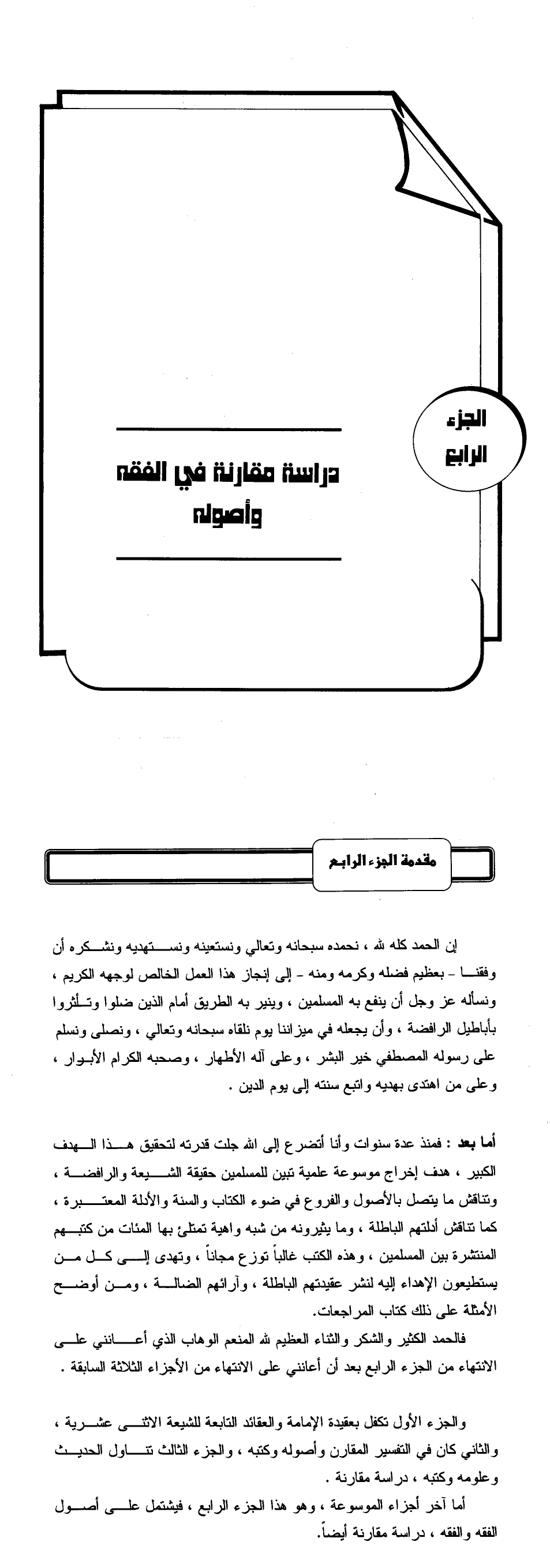 أما آخر أجزاء الموسوعة، وهو هذا الجزء الرابع، فيشتمل على أصول الفقه والفقه، دراسة مقارنة أيضاً.