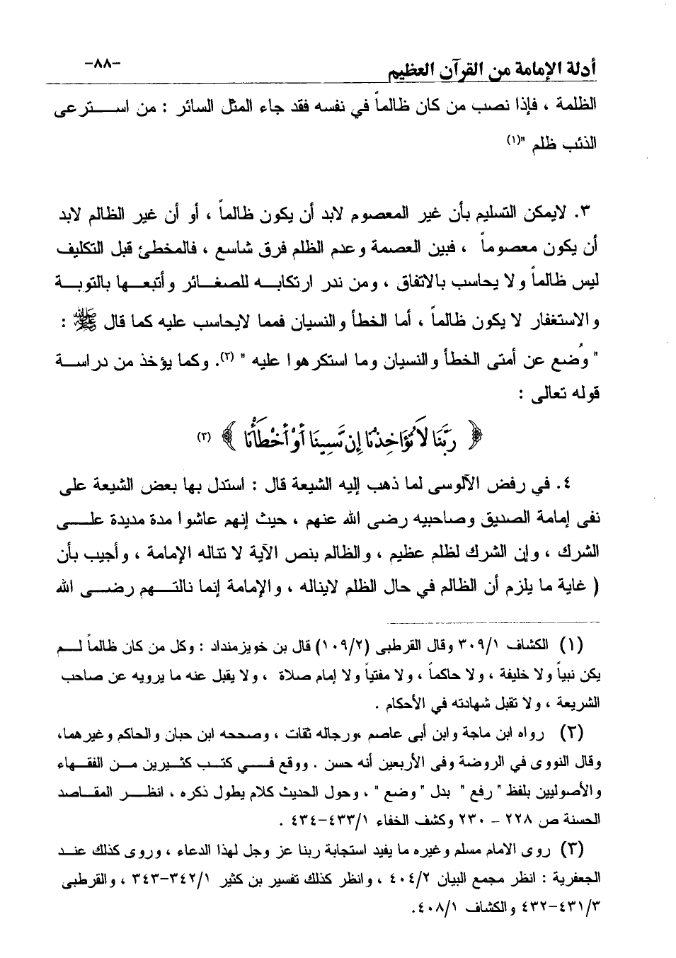 3. لايمكن التسليم بأن غير المعصوم لابد أن يكون ظالماً، أو أن غير الظالم لابد أن يكون معصوماً، فبين العصمة وعدم الظلم فرق شاسع، فالمخطئ قبل التكليف ليس ظالماً ولا يحاسب بالاتفاق، ومن ندر ارتكابه للصغائر وأتبعها بالتوبة والاستغفار لا يكون ظالماً، أما الخطأ والنسيان فمما لايحاسب عليه كما قال صَلَّى اللهُ عَلَيْهِ وَسَلَّمَ: " وُضع عن أمتى الخطأ والنسيان وما استكرهوا عليه " (¬2) . وكما يؤخذ من دراسة قوله تعالى:
