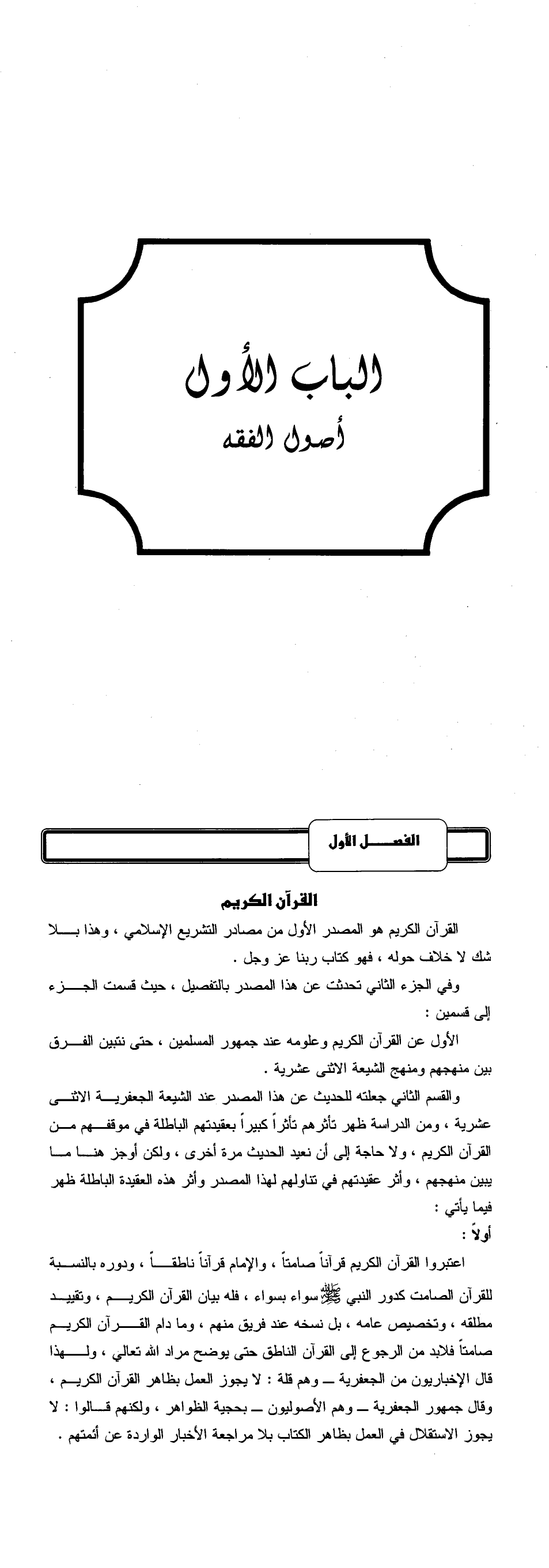 الأول عن القرآن الكريم وعلومه عند جمهور المسلمين، حتى نتبين الفرق بين منهجهم ومنهج الشيعة الاثنى عشرية.