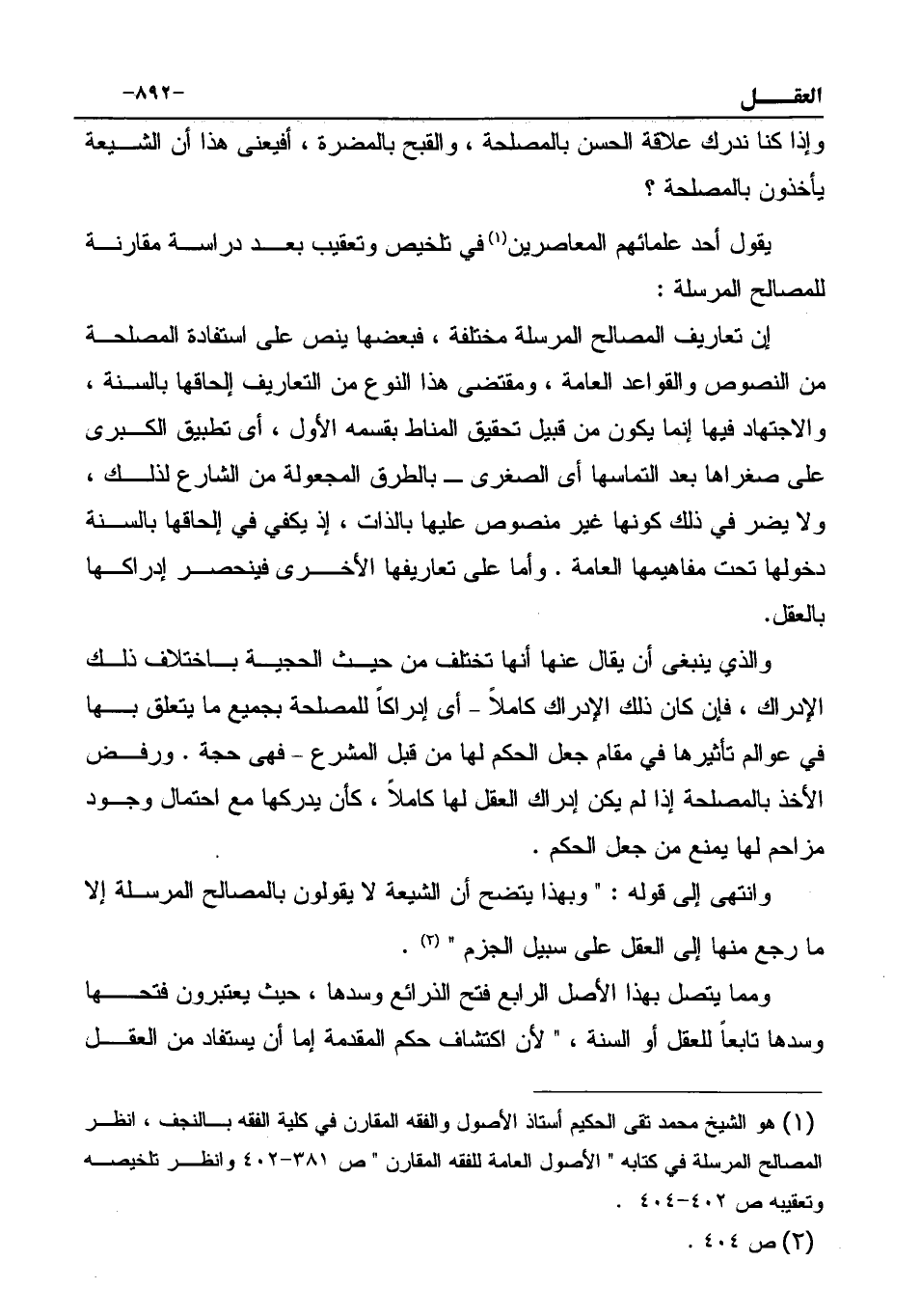 (¬1) هو الشيخ محمد تقى الحكيم أستاذ الأصول والفقه المقارن في كلية الفقه بالنجف، انظر المصالح المرسلة في كتابه " الأصول العامة للفقه المقارن " ص 381-402 وانظر تلخيصه وتعقيبه ص 402-404.
