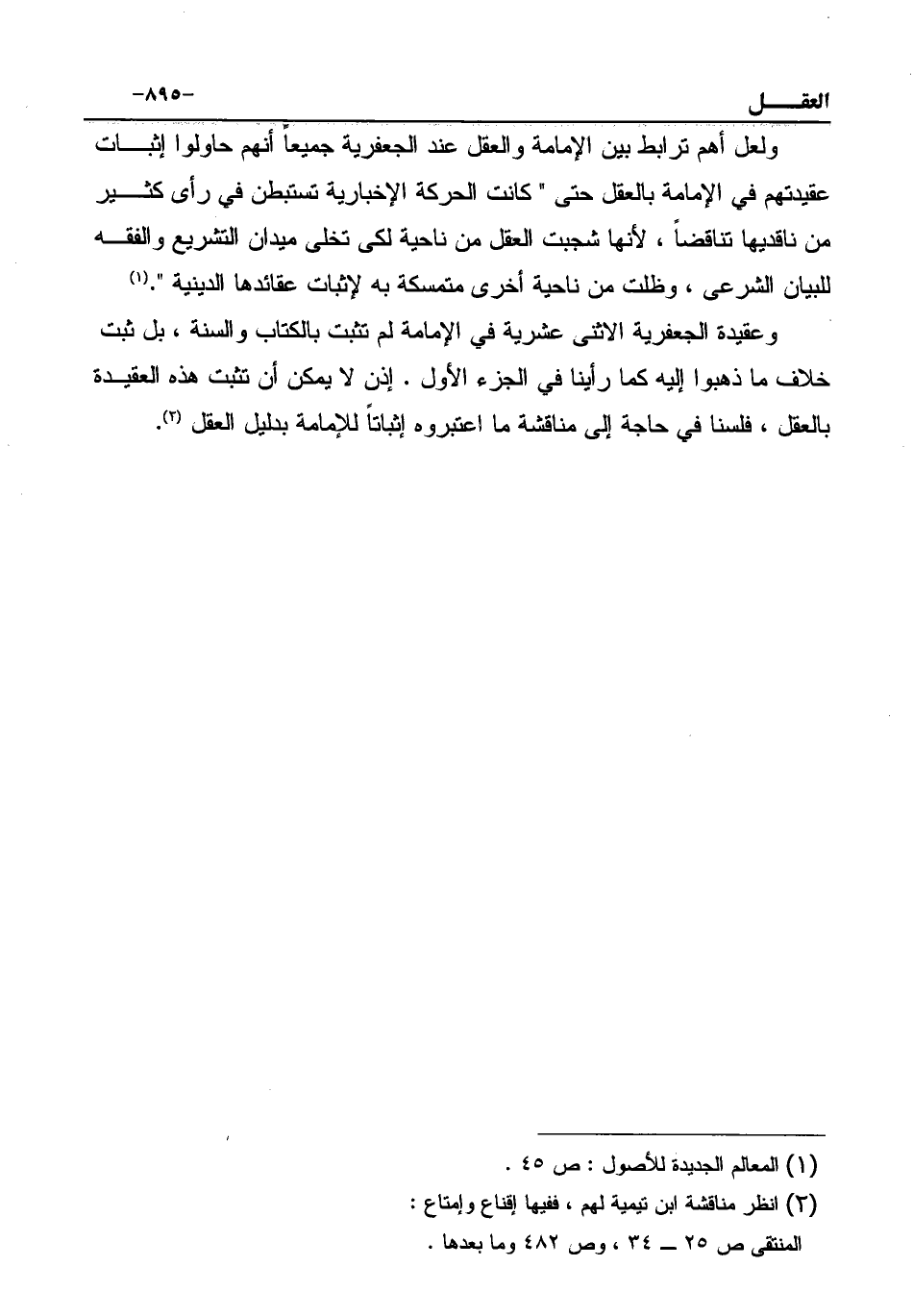 وعقيدة الجعفرية الاثنى عشرية في الإمامة لم تثبت بالكتاب والسنة، بل ثبت خلاف ما ذهبوا إليه كما رأينا في الجزء الأول. إذن لا يمكن أن تثبت هذه العقيدة بالعقل، فلسنا في حاجة إلى مناقشة ما اعتبروه إثباتاً للإمامة بدليل العقل (¬2) .