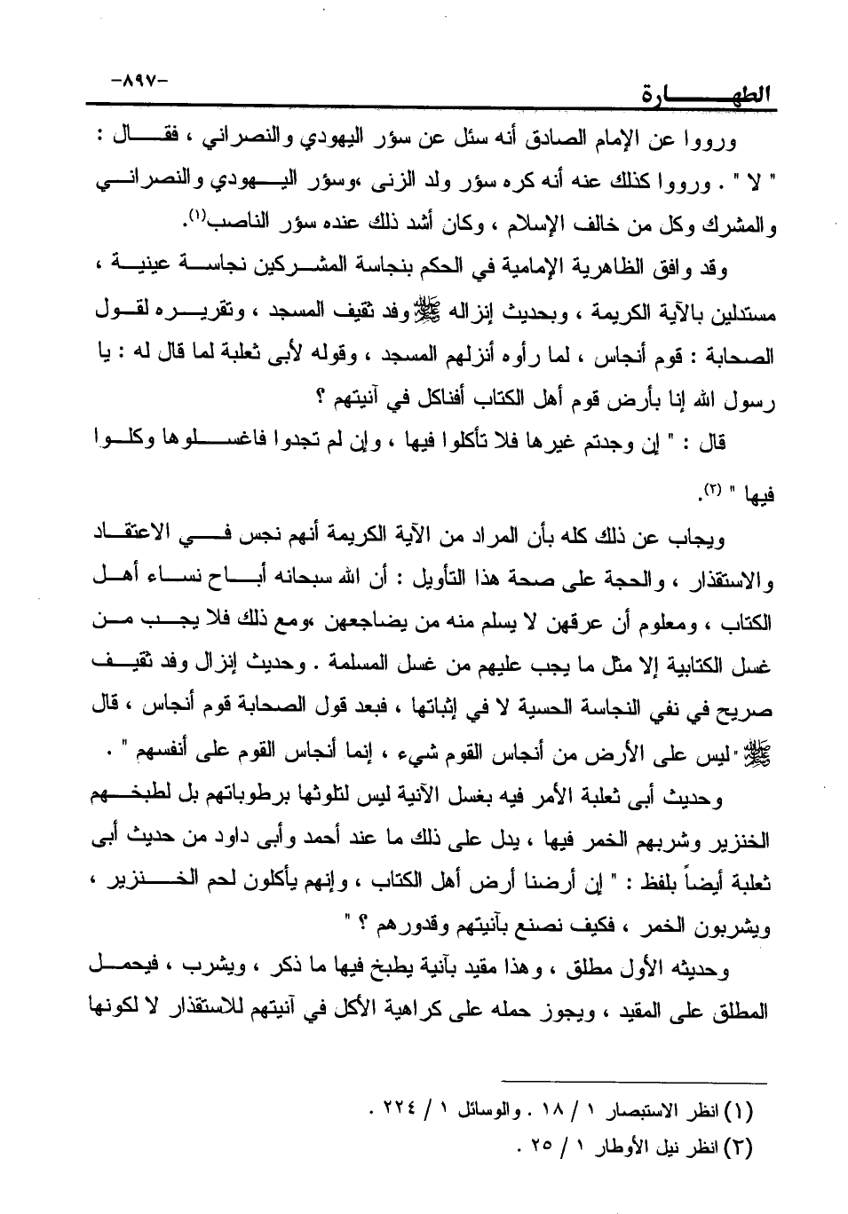 ويجاب عن ذلك كله بأن المراد من الآية الكريمة أنهم نجس في الاعتقاد والاستقذار، والحجة على صحة هذا التأويل: أن الله سبحانه أباح نساء أهل الكتاب، ومعلوم أن عرقهن لا يسلم منه من يضاجعهن، ومع ذلك فلا يجب من غسل الكتابية إلا مثل ما يجب عليهم من غسل المسلمة. وحديث إنزال وفد ثقيف صريح في نفي النجاسة الحسية لا في إثباتها، فبعد قول الصحابة قوم أنجاس، قال - صَلَّى اللهُ عَلَيْهِ وَسَلَّمَ - " ليس على الأرض من أنجاس القوم شيء، إنما أنجاس القوم على أنفسهم ".
