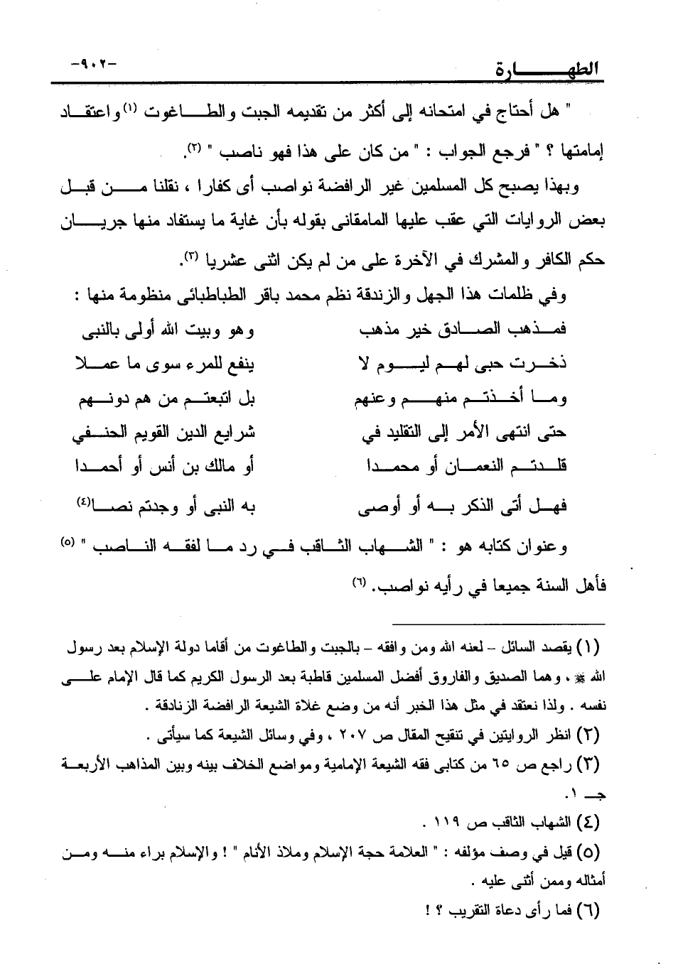 هل أحتاج في امتحانه إلى أكثر من تقديمه الجبت والطاغوت (¬1) واعتقاد إمامتها؟ " فرجع الجواب: " من كان على هذا فهو ناصب " (¬2) .