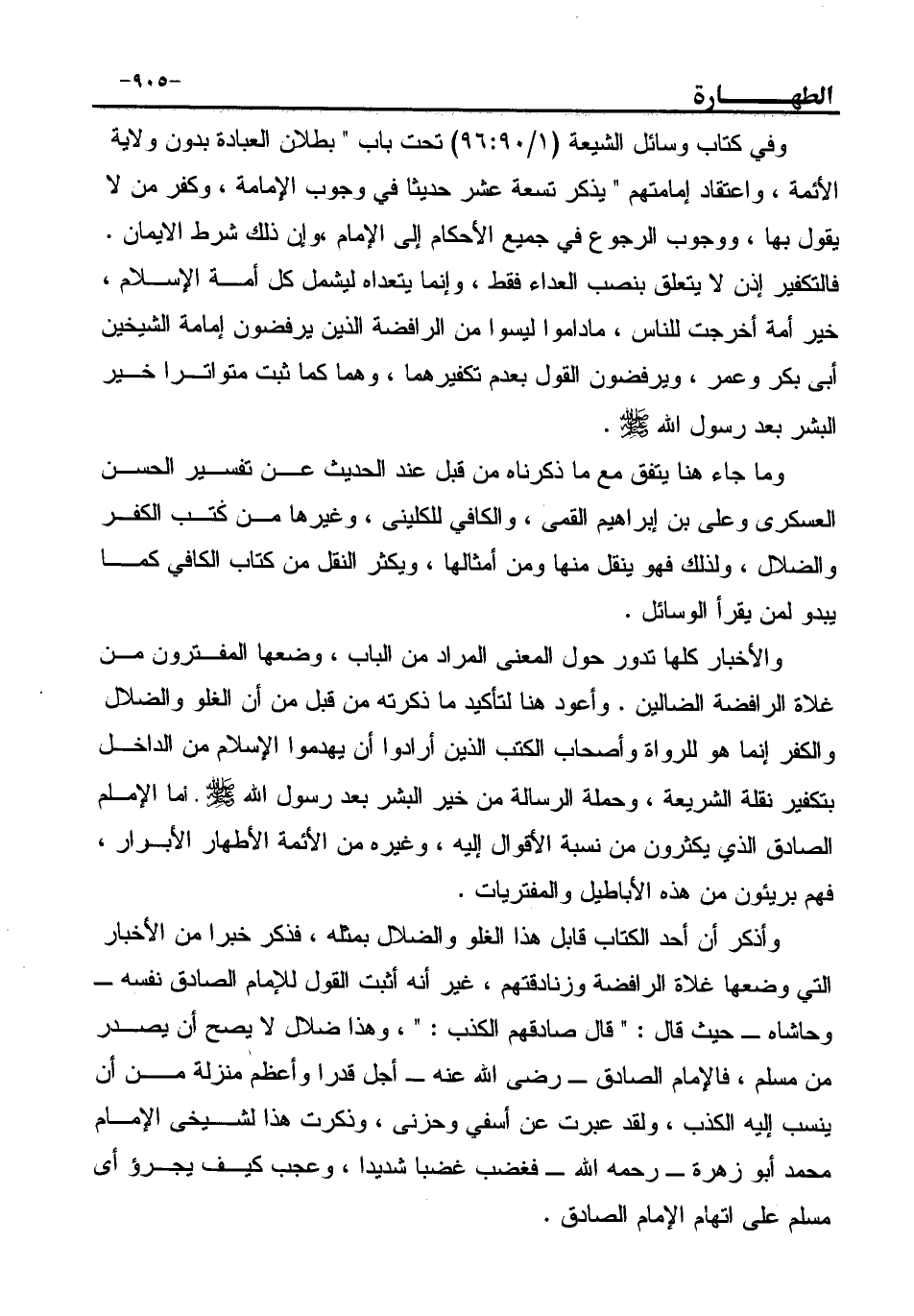 والأخبار كلها تدور حول المعنى المراد من الباب، وضعها المفترون من غلاة الرافضة الضالين. وأعود هنا لتأكيد ما ذكرته من قبل من أن الغلو والضلال والكفر إنما هو للرواة وأصحاب الكتب الذين أرادوا أن يهدموا الإسلام من الداخل بتكفير نقلة الشريعة، وحملة الرسالة من خير البشر بعد رسول الله - صَلَّى اللهُ عَلَيْهِ وَسَلَّمَ -. أما الإمام الصادق الذي يكثرون من نسبة الأقوال إليه، وغيره من الأئمة الأطهار الأبرار، فهم بريئون من هذه الأباطيل والمفتريات.