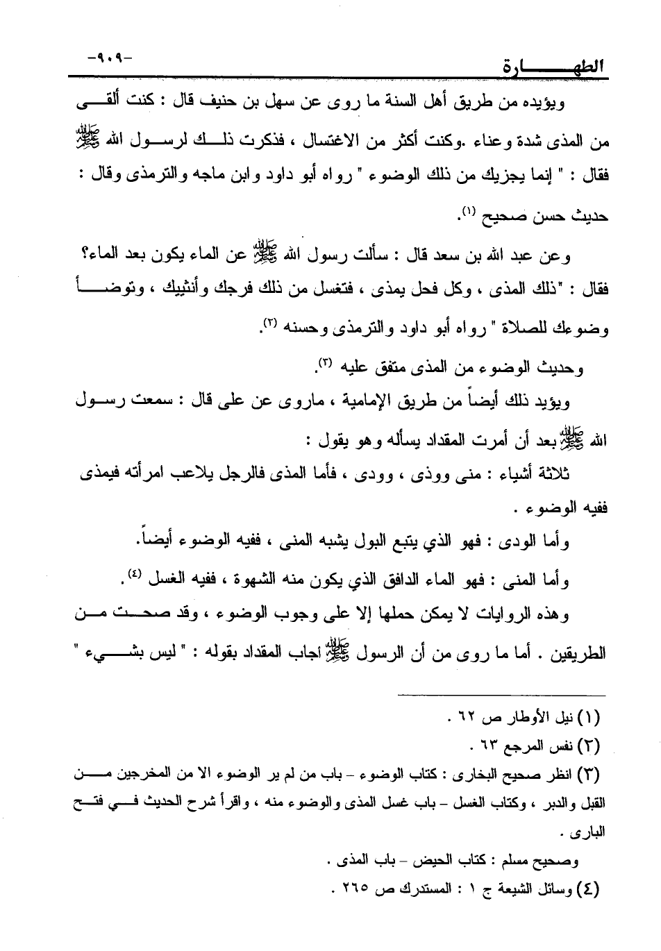 (¬3) انظر صحيح البخارى: كتاب الوضوء – باب من لم ير الوضوء الا من المخرجين من القبل والدبر، وكتاب الغسل – باب غسل المذى والوضوء منه، واقرأ شرح الحديث في فتح البارى.