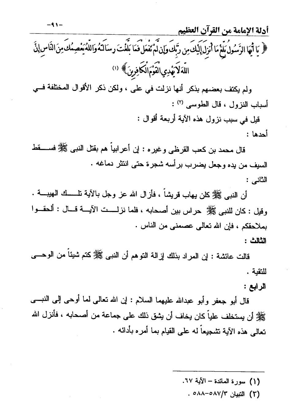 يَا أَيُّهَا الرَّسُولُ بَلِّغْ مَا أُنزِلَ إِلَيْكَ مِن رَّبِّكَ وَإِن لَّمْ تَفْعَلْ فَمَا بَلَّغْتَ رِسَالَتَهُ وَاللهُ يَعْصِمُكَ مِنَ النَّاسِ إِنَّ اللهَ لاَ يَهْدِي الْقَوْمَ الْكَافِرِينَ" (¬1)