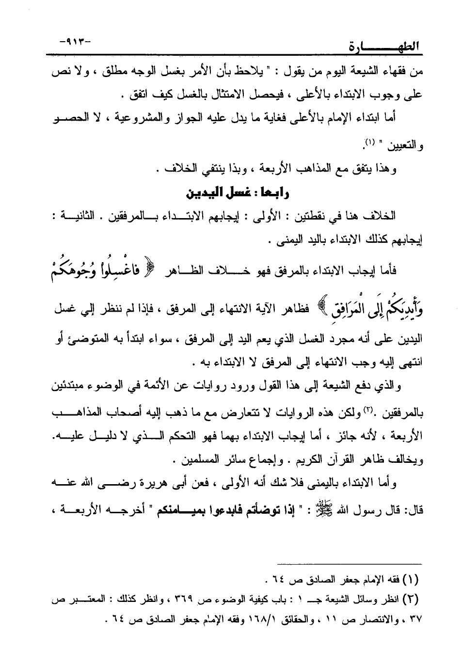 (¬2) انظر وسائل الشيعة جـ 1: باب كيفية الوضوء ص 369، وانظر كذلك: المعتبر ص 37، والانتصار ص 11، والحقائق 1/168 وفقه الإمام جعفر الصادق ص 64.