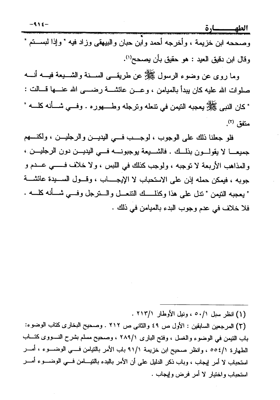 (¬2) المرجعين السابقين: الأول ص 49 والثانى ص 212. وصحيح البخارى كتاب الوضوء: باب التيمن في الوضوء والغسل، وفتح البارى 1/289، وصحيح مسلم بشرح النووى كتاب الطهارة 1/554، وانظر صحيح ابن خزيمة 1/91 باب الأمر بالتيامن في الوضوء، أمر استحباب لا أمر إيجاب، وباب ذكر الدليل على أن الأمر بالبدء بالتيامن في الوضوء أمر استحباب واختيار لا أمر فرض وإيجاب.