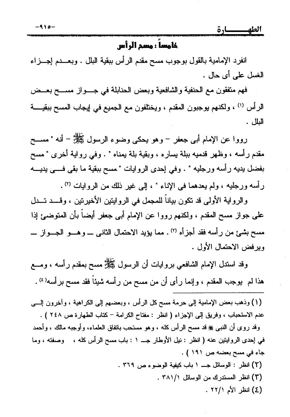 (¬1) وذهب بعض الإمامية إلى حرمة مسح كل الرأس، وبعضهم إلى الكراهية، وآخرون إلى عدم الاستحباب، وفريق إلى الإجزاء (انظر: مفتاح الكرامة - كتاب الطهارة ص 248) .