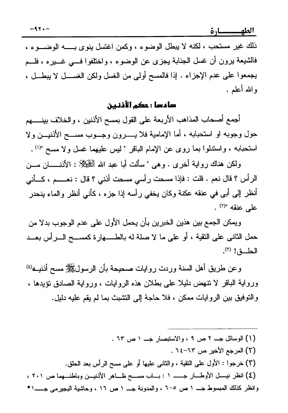 (¬4) انظر نيل الأوطار جـ 1: باب مسح ظاهر الأذنين وباطنهما ص 201، وانظر كذلك المبسوط جـ 1 ص 5-6، والمدونة جـ 1 ص 16، وحاشية البجيرمى جـ1* *ص 88، والمغنى جـ 1 ص 120، الهداية في تخريج أحاديث البداية 1/147، وصحيح ابن خزيمة 1 /77.
