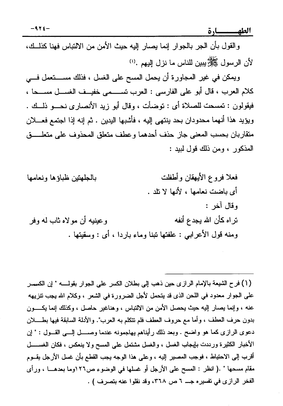 (¬1) فرح الشيعة بالإمام الرازى حين ذهب إلى بطلان الكسر على الجوار بقوله " إن الكسر على الجوار معدود في اللحن الذى قد يتحمل لأجل الضرورة في الشعر، وكلام الله يجب تنزيهه عنه، وإنما يصار إليه حيث يحصل الأمن من الالتباس، وهناغير حاصل، وكذلك إنما يكون بدون حرف العطف، وأما مع حروف العطف فلم تتكلم به العرب". والأدلة السابقة فيها بطلان دعوى الرازى كما هو واضح. وبعد ذلك رأيناهم يهاجمونه عندما وصل إلى القول: " إن الأخبار الكثيرة ورددت بإيجاب الغسل، والغسل مشتمل على المسح ولا ينعكس، فكان الغسل أقرب إلى الاحتياط، فوجب المصير إليه، وعلى هذا الوجه يجب القطع بأن غسل الأرجل يقوم مقام مسحها ". (انظر: المسح على الأرجل أو غسلها في الوضوء ص126وما بعدها، ورأي الفخر الرازى في تفسيره جـ 6 ص 368، وقد نقلوا عنه بتصرف) .