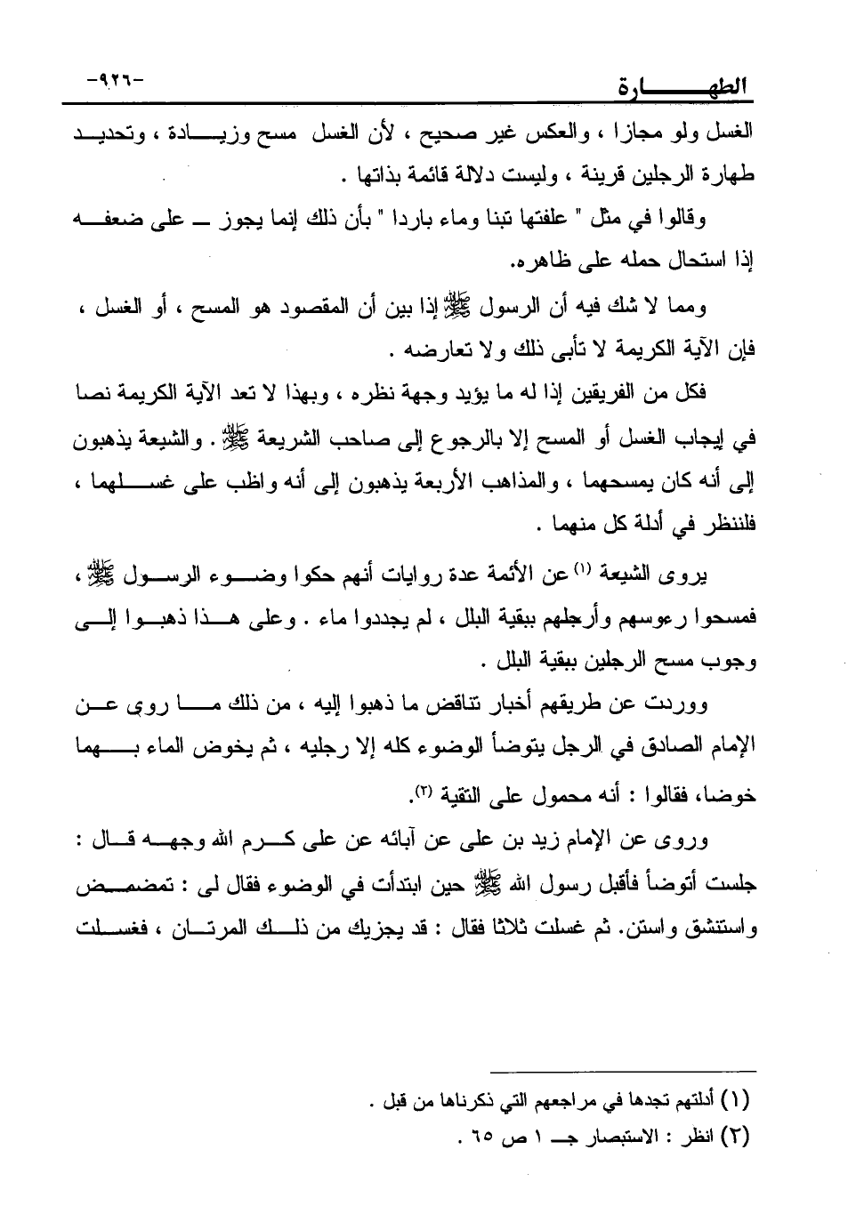 فكل من الفريقين إذا له ما يؤيد وجهة نظره، وبهذا لا تعد الآية الكريمة نصاً في إيجاب الغسل أو المسح إلا بالرجوع إلى صاحب الشريعة - صَلَّى اللهُ عَلَيْهِ وَسَلَّمَ -. والشيعة يذهبون إلى أنه كان يمسحهما، والمذاهب الأربعة يذهبون إلى أنه واظب على غسلهما، فلننظر في أدلة كل منهما.