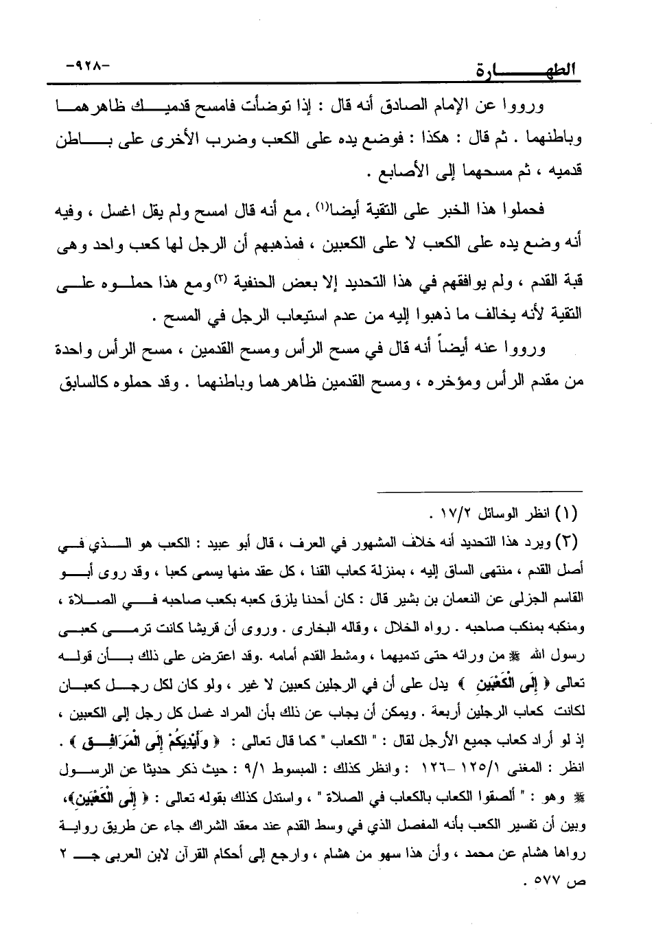 فحملوا هذا الخبر على التقية أيضا (¬1) ، مع أنه قال امسح ولم يقل اغسل، وفيه أنه وضع يده على الكعب لا على الكعبين، فمذهبهم أن الرجل لها كعب واحد وهي قبة القدم، ولم يوافقهم في هذا التحديد إلا بعض الحنفية (¬2) ومع هذا حملوه على التقية لأنه يخالف ما ذهبوا إليه من عدم استيعاب الرجل في المسح.