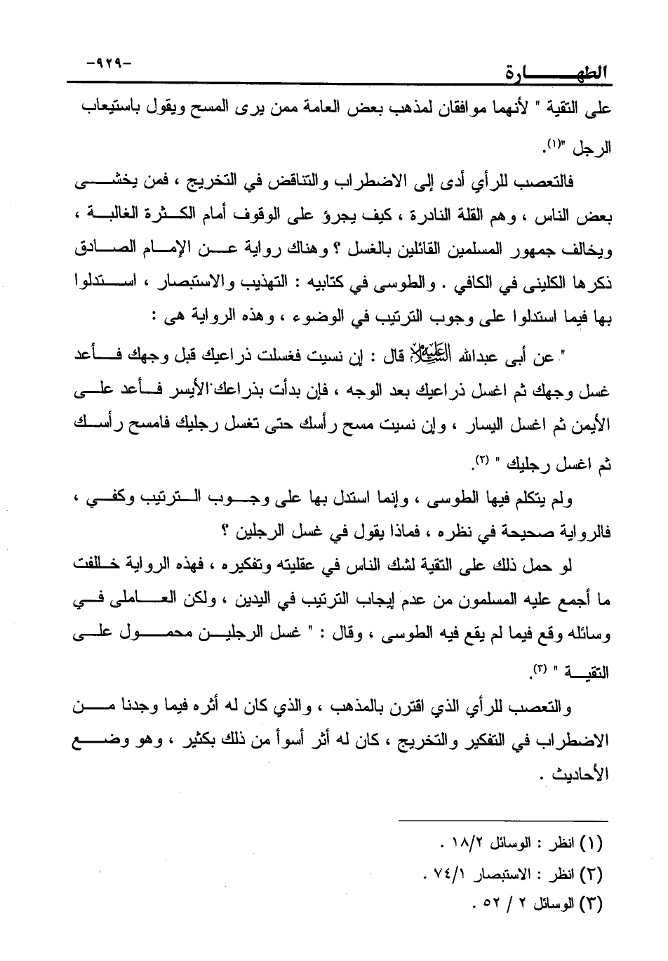 فالتعصب للرأي أدى إلى الاضطراب والتناقض في التخريج، فمن يخشى بعض الناس، وهم القلة النادرة، كيف يجرؤ على الوقوف أمام الكثرة الغالبة، ويخالف جمهور المسلمين القائلين بالغسل؟ وهناك رواية عن الإمام الصادق ذكرها الكليني في الكافي. والطوسى في كتابيه: التهذيب والاستبصار، استدلوا بها فيما استدلوا على وجوب الترتيب في الوضوء، وهذه الرواية هي:
