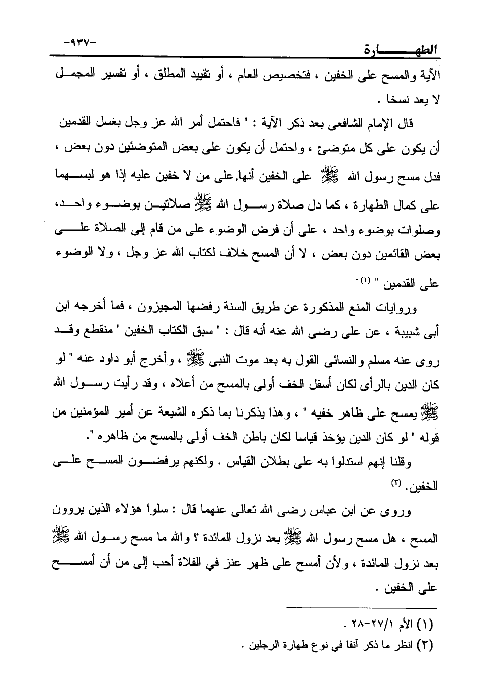 قال الإمام الشافعى بعد ذكر الآية: " فاحتمل أمر الله عز وجل بغسل القدمين أن يكون على كل متوضئ، واحتمل أن يكون على بعض المتوضئين دون بعض، فدل مسح رسول الله - صَلَّى اللهُ عَلَيْهِ وَسَلَّمَ - على الخفين أنها على من لا خفين عليه إذا هو لبسهما على كمال الطهارة، كما دل صلاة رسول الله - صَلَّى اللهُ عَلَيْهِ وَسَلَّمَ - صلاتين بوضوء واحد، وصلوات بوضوء واحد، على أن فرض الوضوء على من قام إلى الصلاة على بعض القائمين دون بعض، لا أن المسح خلاف لكتاب الله عز وجل، ولا الوضوء على القدمين " (¬1) .