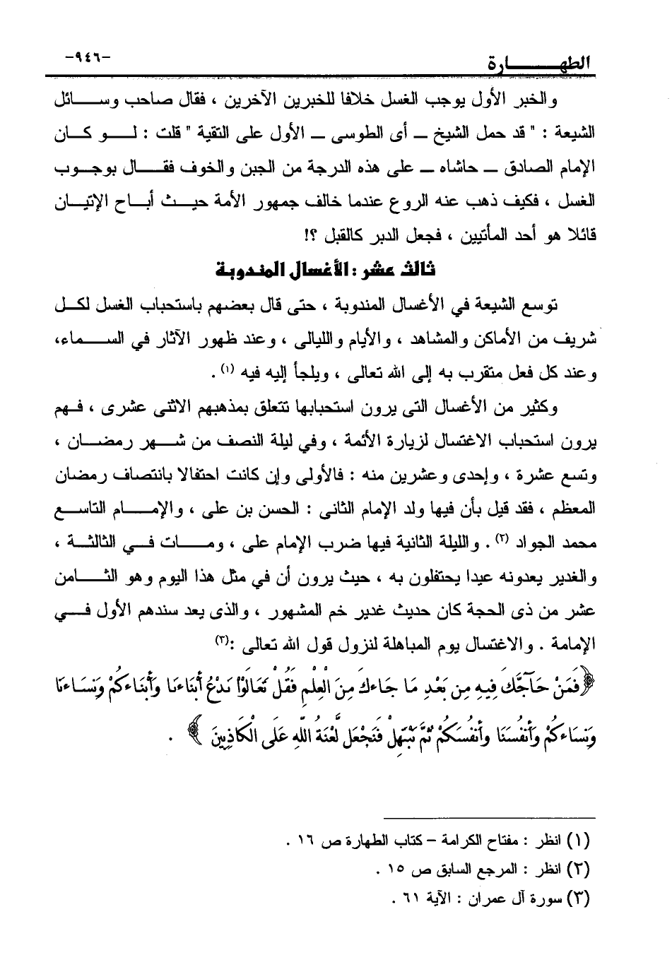 وكثير من الأغسال التى يرون استحبابها تتعلق بمذهبهم الاثنى عشرى، فهم يرون استحباب الاغتسال لزيارة الأئمة، وفي ليلة النصف من شهر رمضان، وتسع عشرة، وإحدى وعشرين منه: فالأولى وإن كانت احتفالا بانتصاف رمضان المعظم، فقد قيل بأن فيها ولد الإمام الثانى: الحسن بن على، والإمام التاسع محمد الجواد (¬2) . والليلة الثانية فيها ضرب الإمام على، ومات في الثالثة، والغدير يعدونه عيداً يحتفلون به، حيث يرون أن في مثل هذا اليوم وهو الثامن عشر من ذى الحجة كان حديث غدير خم المشهور، والذى يعد سندهم الأول في الإمامة. والاغتسال يوم المباهلة لنزول قول الله تعالى: (¬3)