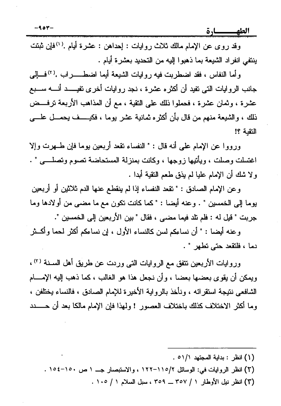 وروايات الأربعين تتفق مع الروايات التى وردت عن طريق أهل السنة (¬3) ، ويمكن أن يقوى بعضها بعضاً، وأن نجعل هذا هو الغالب، كما ذهب إليه الإمام الشافعى نتيجة استقرائه، ونأخذ بالرواية الأخيرة للإمام الصادق، فالنساء يختلفن، وما أكثر الاختلاف كذلك باختلاف العصور! ولهذا فإن الإمام مالكاً بعد أن حدد
