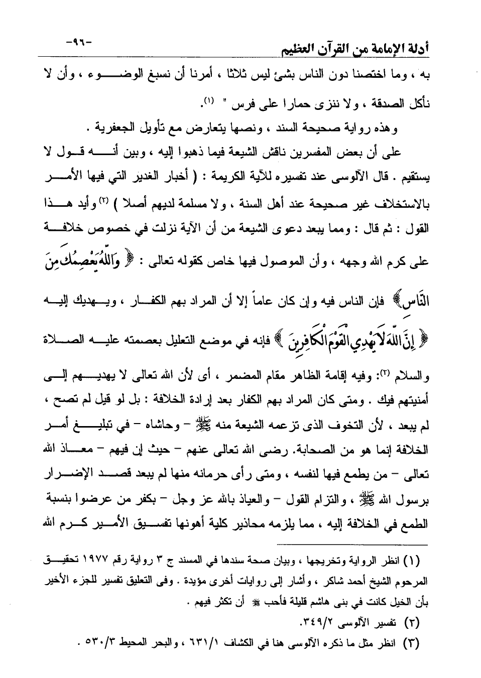 على أن بعض المفسرين ناقش الشيعة فيما ذهبوا إليه، وبين أنه قول لا يستقيم. قال الآلوسى عند تفسيره للآية الكريمة: (أخبار الغدير التي فيها الأمر بالاستخلاف غير صحيحة عند أهل السنة، ولا مسلمة لديهم أصلاً) (¬2) وأيد هذا القول: ثم قال: ومما يبعد دعوى الشيعة من أن الآية نزلت في خصوص خلافة على كرم الله وجهه، وأن الموصول فيها خاص كقوله تعالى: " وَاللهُ يَعْصِمُكَ مِنَ النَّاسِ" فإن الناس فيه وإن كان عاماً إلا أن المراد بهم الكفار، ويهديك إليه ... " إِنَّ اللهَ لاَ يَهْدِي الْقَوْمَ الْكَافِرِينَ " فإنه في موضع التعليل بعصمته عليه الصلاة والسلام (¬3) : وفيه إقامة الظاهر مقام المضمر، أي لأن الله تعالى لا يهديهم إلى أمنيتهم فيك. ومتى كان المراد بهم الكفار بعد إرادة الخلافة: بل لو قيل لم تصح، لم يبعد، لأن التخوف الذي تزعمه الشيعة منه صَلَّى اللهُ عَلَيْهِ وَسَلَّمَ - وحاشاه - في تبليغ أمر الخلافة إنما هو من الصحابة. رضي الله تعالى عنهم - حيث إن فيهم - معاذ الله تعالى - من يطمع فيها لنفسه، ومتى رأي حرمانه منها لم يبعد قصد الإضرار برسول الله صَلَّى اللهُ عَلَيْهِ وَسَلَّمَ، والتزام القول - والعياذ بالله عز وجل - بكفر من عرضوا بنسبة الطمع في الخلافة إليه، مما يلزمه محاذير كلية أهونها تفسيق الأمير كرم الله