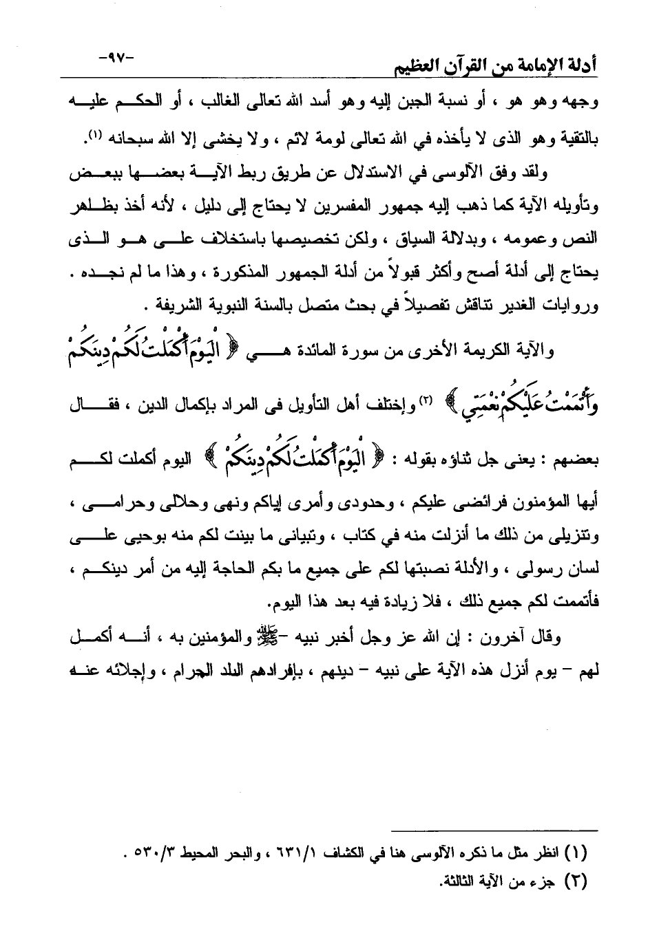 والآية الكريمة الأخرى من سورة المائدة هي " الْيَوْمَ أَكْمَلْتُ لَكُمْ دِينَكُمْ وَأَتْمَمْتُ عَلَيْكُمْ نِعْمَتِي " (¬2) وإختلف أهل التأويل في المراد بإكمال الدين، فقال بعضهم: يعنى جل ثناؤه بقوله: " الْيَوْمَ أَكمَلْتُ لَكُمْ دِينَكُمْ " اليوم أكملت لكم أيها المؤمنون فرائضى عليكم، وحدودى وأمرى إياكم ونهى وحلالى وحرامى، وتنزيلى من ذلك ما أنزلت منه في كتاب، وتبيانى ما بينت لكم منه بوحيى على لسان رسولى، والأدلة نصبتها لكم على جميع ما بكم الحاجة إليه من أمر دينكم، فأتممت لكم جميع ذلك، فلا زيادة فيه بعد هذا اليوم.