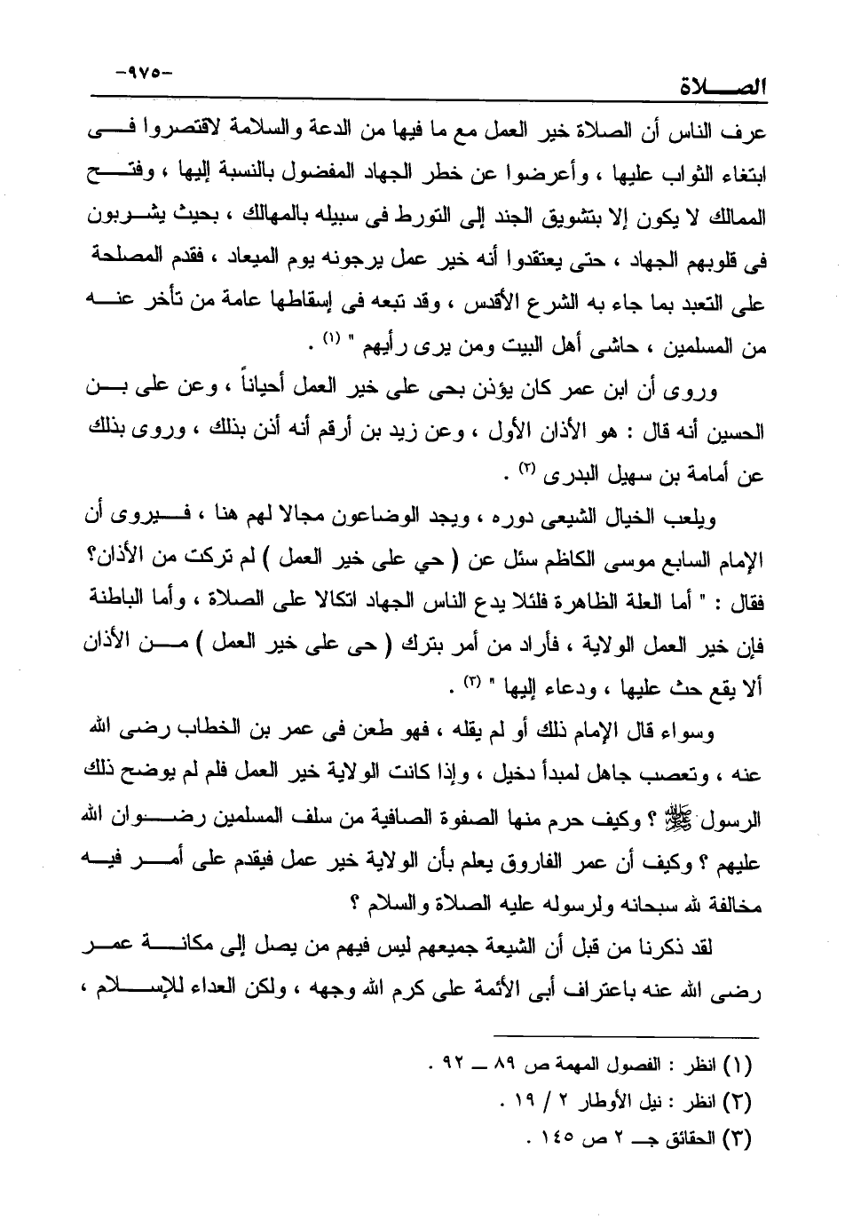 ويلعب الخيال الشيعى دوره، ويجد الوضاعون مجالا لهم هنا، فيروى أن الإمام السابع موسى الكاظم سئل عن (حي على خير العمل) لم تركت من الأذان؟ فقال: " أما العلة الظاهرة فلئلا يدع الناس الجهاد اتكالا على الصلاة، وأما الباطنة فإن خير العمل الولاية، فأراد من أمر بترك (حى على خير العمل) من الأذان ألا يقع حث عليها، ودعاء إليها " (¬3) .
