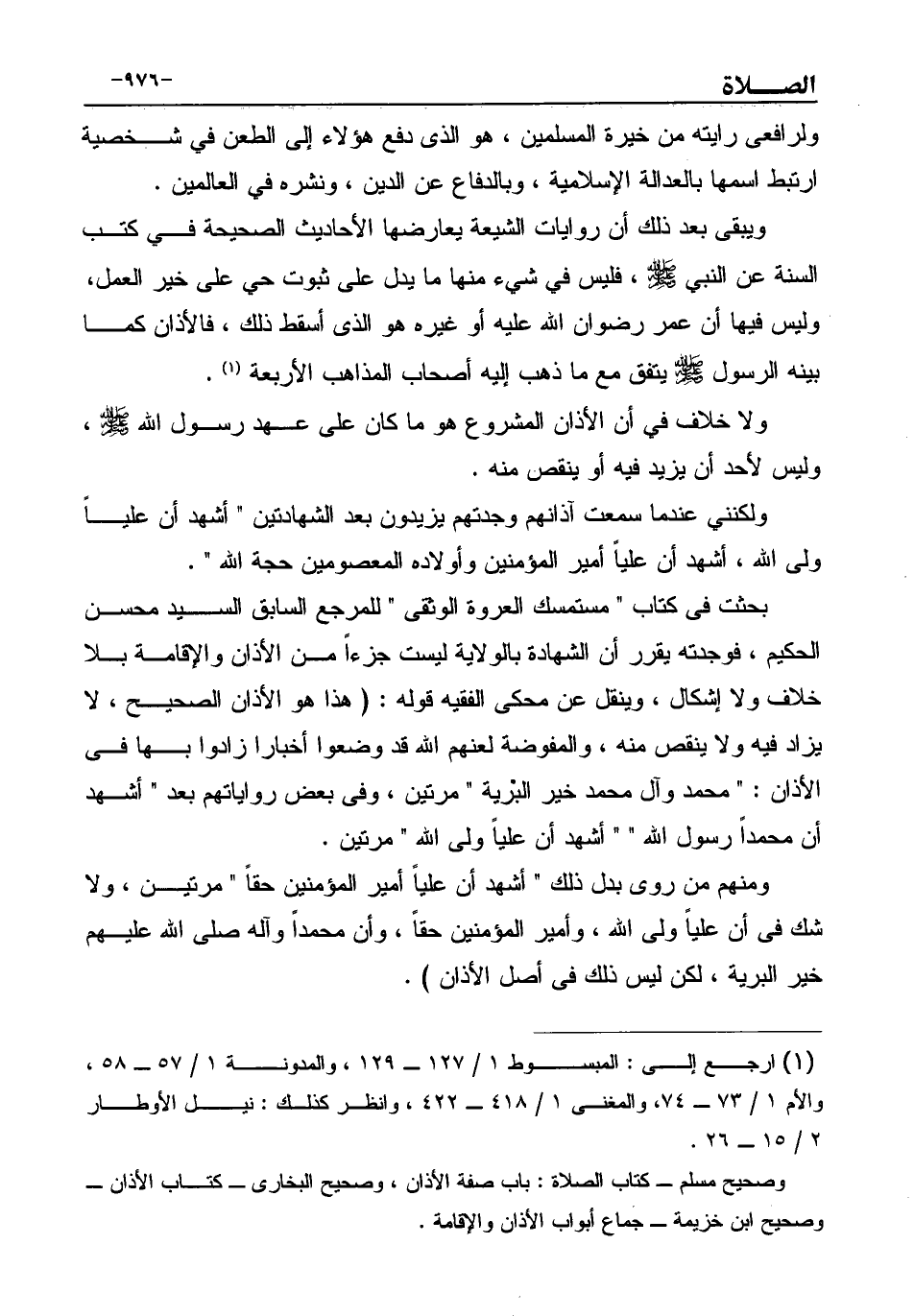 بحثت فى كتاب " مستمسك العروة الوثقى " للمرجع السابق السيد محسن الحكيم، فوجدته يقرر أن الشهادة بالولاية ليست جزءاً من الأذان والإقامة بلا خلاف ولا إشكال، وينقل عن محكى الفقيه قوله: (هذا هو الأذان الصحيح، لا يزاد فيه ولا ينقص منه، والمفوضة لعنهم الله قد وضعوا أخبارا زادوا بها فى الأذان: " محمد وآل محمد خير البرية " مرتين، وفى بعض رواياتهم بعد " أشهد أن محمداً رسول الله " " أشهد أن علياً ولى الله " مرتين.